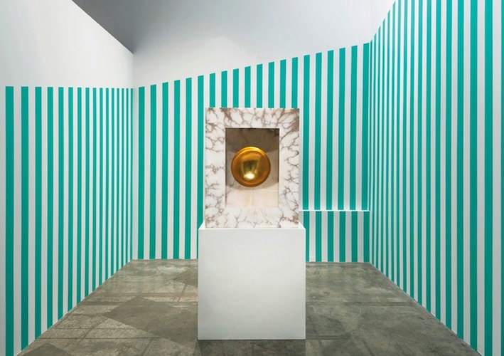 Scendendo al piano inferiore della galleria le opere dei due artisti dialogano serratamente: le strisce colorate verdi e bianche di Buren avvolgono idealmente la scultura in alabastro bianco di Kapoor.