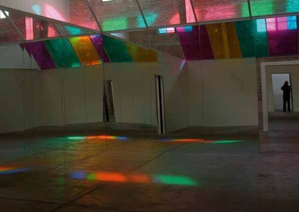 permanenti, delle quali la prima e forse la più celebre è Les Deux Plateaux (1985-1986) al Palais-Royale. Nel 1986 si aggiudica il Leone d’Oro alla Biennale di Venezia per il miglior padiglione. Molto presto l’interesse di Buren si focalizza sull’ascendente dell’architettura (particolarmente quella museale) sull’arte. Egli comincia a sviluppare un lavoro più tridimensionale e una concezione dell’opera che non è più oggetto ma modulazione dello spazio. Del 1975 è la prima Cabane Eclatée che costituisce una vera svolta, accentuando l’interdipendenza tra l’opera e il luogo che la accoglie attraverso giochi sapienti di costruzione e decostruzione: l’opera stessa diventa il suo proprio sito oltre che il luogo del movimento e della deambulazione. Le proposte più recenti si presentano come dispositivi architettonici sempre più complessi, che intrattengono costantemente un dialogo con l’architettura esistente. Tali proposte si manifestano in una vera e propria alterazione dello spazio, una moltiplicazione di giochi sui materiali (legno, vinile, materie plastiche, reticolati) e in una esplosione del colore. Dopo l’inizio degli anni ’90 il colore non è più solamente applicato ai muri, ma letteralmente “installato nello spazio” sotto forma di filtri, lastre di vetro o plexiglas colorati. L’impressione di esplosione dell’opera, accentuato dall’utilizzo di specchi, incita lo spettatore ad uno spostamento non più solamente dello sguardo ma del corpo intero.