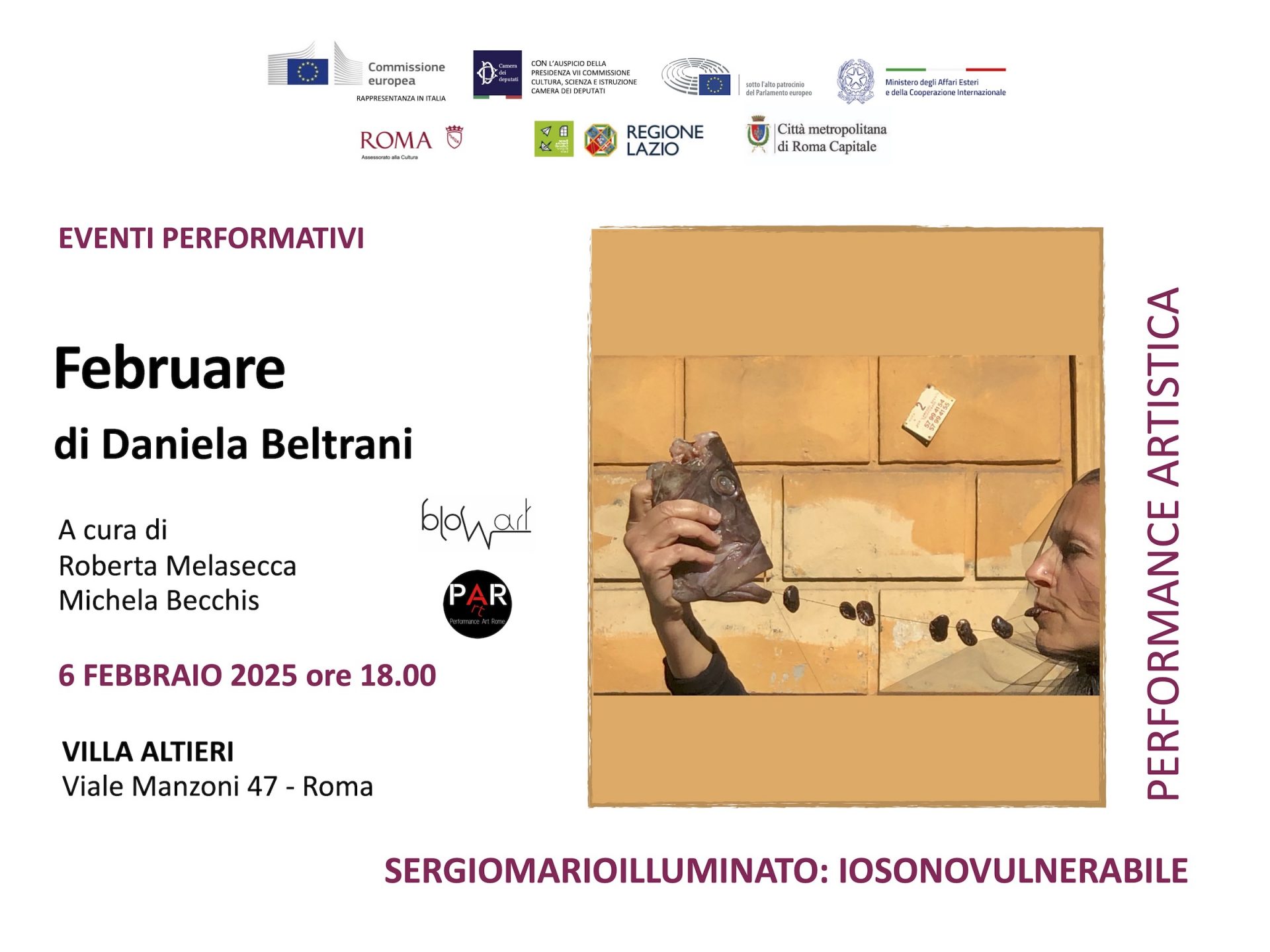 Ultimo appuntamento del ciclo di eventi performativi ‘Dal corpo al corpo dell’arte’ a cura di Roberta Melasecca e Michela Becchis, realizzati nell’ambito della mostra transdisciplinare IOSONOVULNERABILE di Sergio Mario Illuminato: giovedì 6 febbraio 2025 alle ore 18.00, il Museo di Villa Altieri ospiterà la performance ‘FEBRUARE’ di Daniela Beltrani, azione realizzata in collaborazione con PAR PERFORMANCE ART ROME.