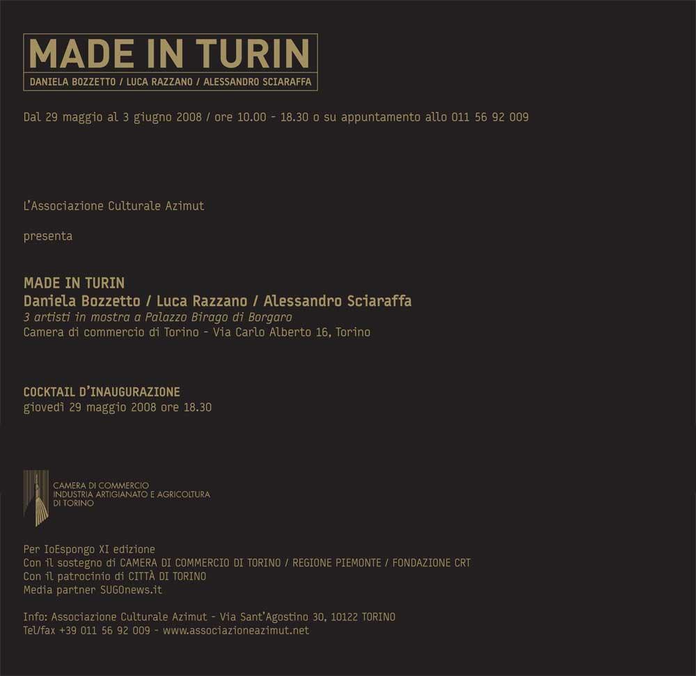 Non è certo un caso la scelta di un titolo come MADE IN TURIN per la prima mostra dell’Associazione Culturale Azimut nelle Sale Storiche della Camera di commercio di Torino. Stanze in cui si respira l’aria importante della grande tradizione sabauda fatta di dedizione al lavoro, costanza e passione, caratteristiche che in qualche modo accomunano il percorso dei tre artisti - Daniela Bozzetto, Luca Razzano e Alessandro Sciaraffa - che, conosciuti nel contesto del concorso IoEspongo lungo la storia ormai ventennale dell’Associazione Culturale Azimut, andiamo oggi a presentare con questa importante esposizione.