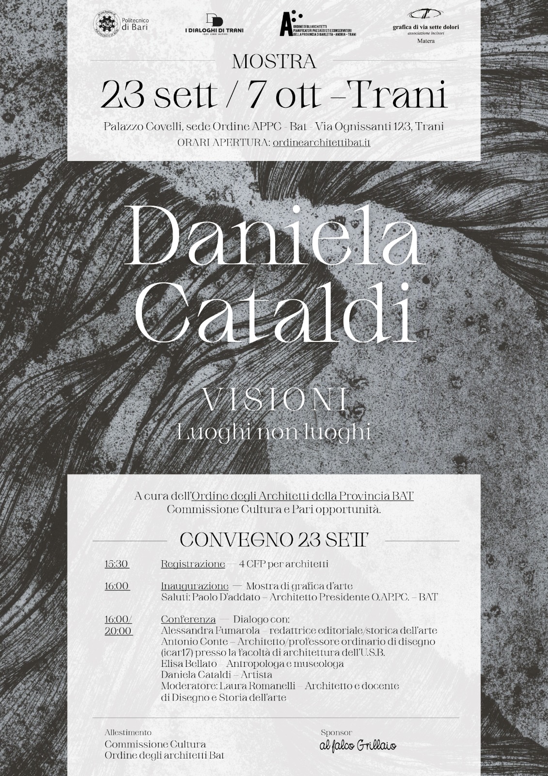 Sarà presentata venerdì 23 settembre, alle ore 16:00 presso Palazzo Covelli di Trani, la mostra personale di grafica d’arte “Daniela Cataldi VISIONI – luoghi non luoghi", a cura della Commissione Cultura e Pari opportunità dell’ordine degli architetti della BAT.