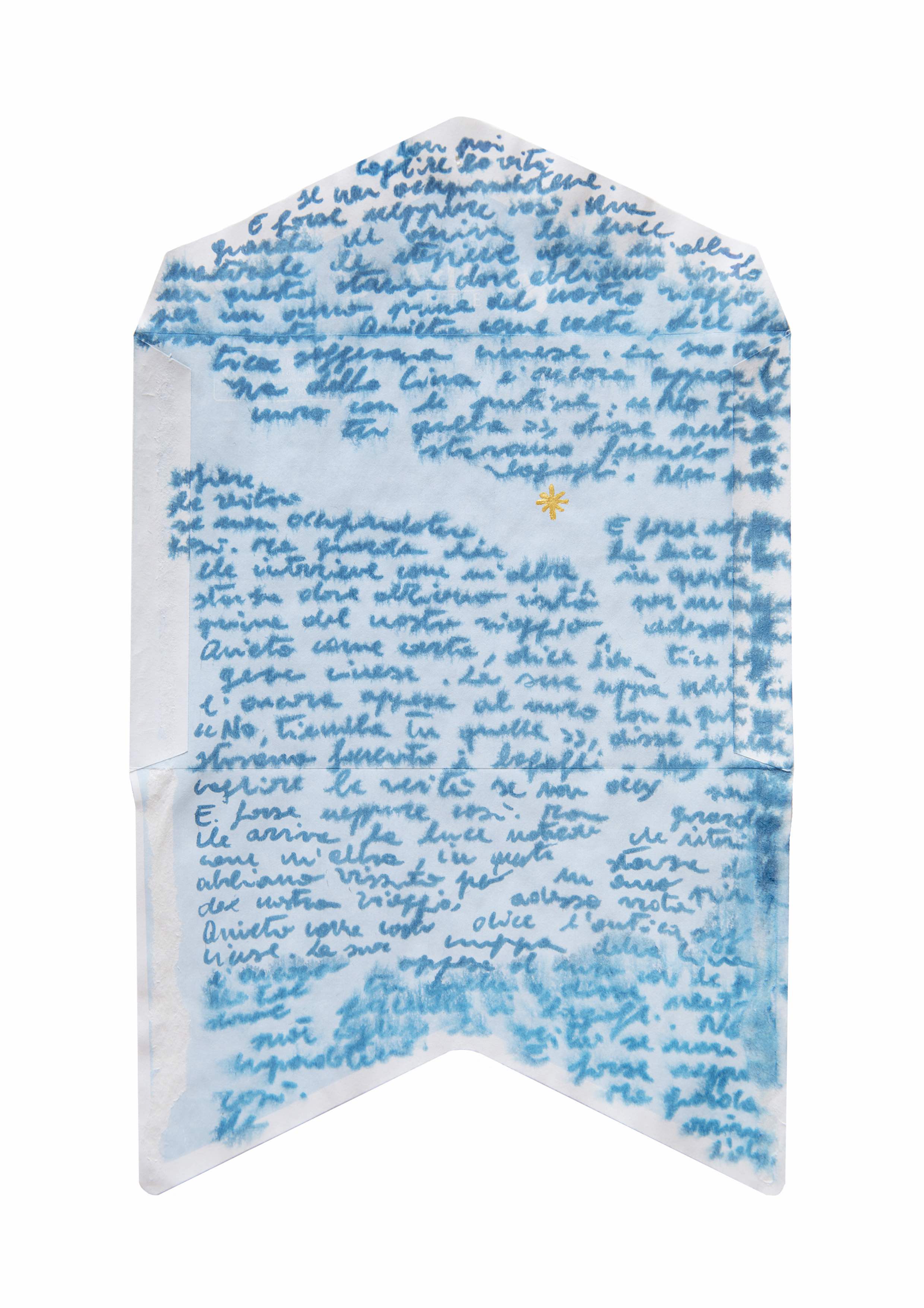 Il testo critico è di Giulia Palladini: "Non tutte le considerazioni sono durature: alcune si dissolvono nel tempo, o rimangono scritte in una lettera mai spedita, chissà, rimasta in una busta chiusa pitturata d’oro - scrive - Altre considerazioni cambiano i suoni in cui sono articolate: quando la lingua si affolla di altri linguaggi (come sempre accade, quando si migra) le parole scoloriscono e si ricompongono. Altre volte succede che le parole si perdano: come in un naufragio, da cui neppure la carta è fatta salva".