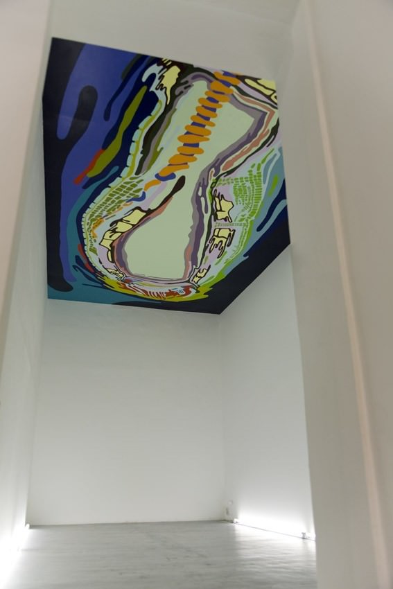 In occasione di questa nuova mostra e per la prima volta d’Arielli abbandona i confini della pittura per avventurarsi nello spazio reale. Con questo progetto - concepito specificamente per le stanze articolate della galleria – l’artista intende mettere in questione il nostro sguardo sulle cose. Il consueto asse frontale della visione umana viene spostato in due opposte direzioni, verso l’alto e verso il basso: il soffitto e il pavimento della galleria diventano così i luoghi che accolgono l’opera. L’invito è quello a rieducare i nostri occhi, a prestare una nuova attenzione alle cose. Allo stesso tempo argomento privilegiato del discorso di d’Arielli è la natura e la fragilità della sua bellezza. Tronchi d’albero diventano il supporto per una serie di disegni, realizzati con l’inserimento di scaglie di pesce. La tautologia enunciata dall’accostamento della carta e del tronco si apre all’ambiguità della collisione tra la sfera terrestre e quella acquatica. Quest’ultima è invece letteralmente sovrastante sul soffitto che ospita su scala monumentale l’universo fluido che è la cifra dominante dell’artista.