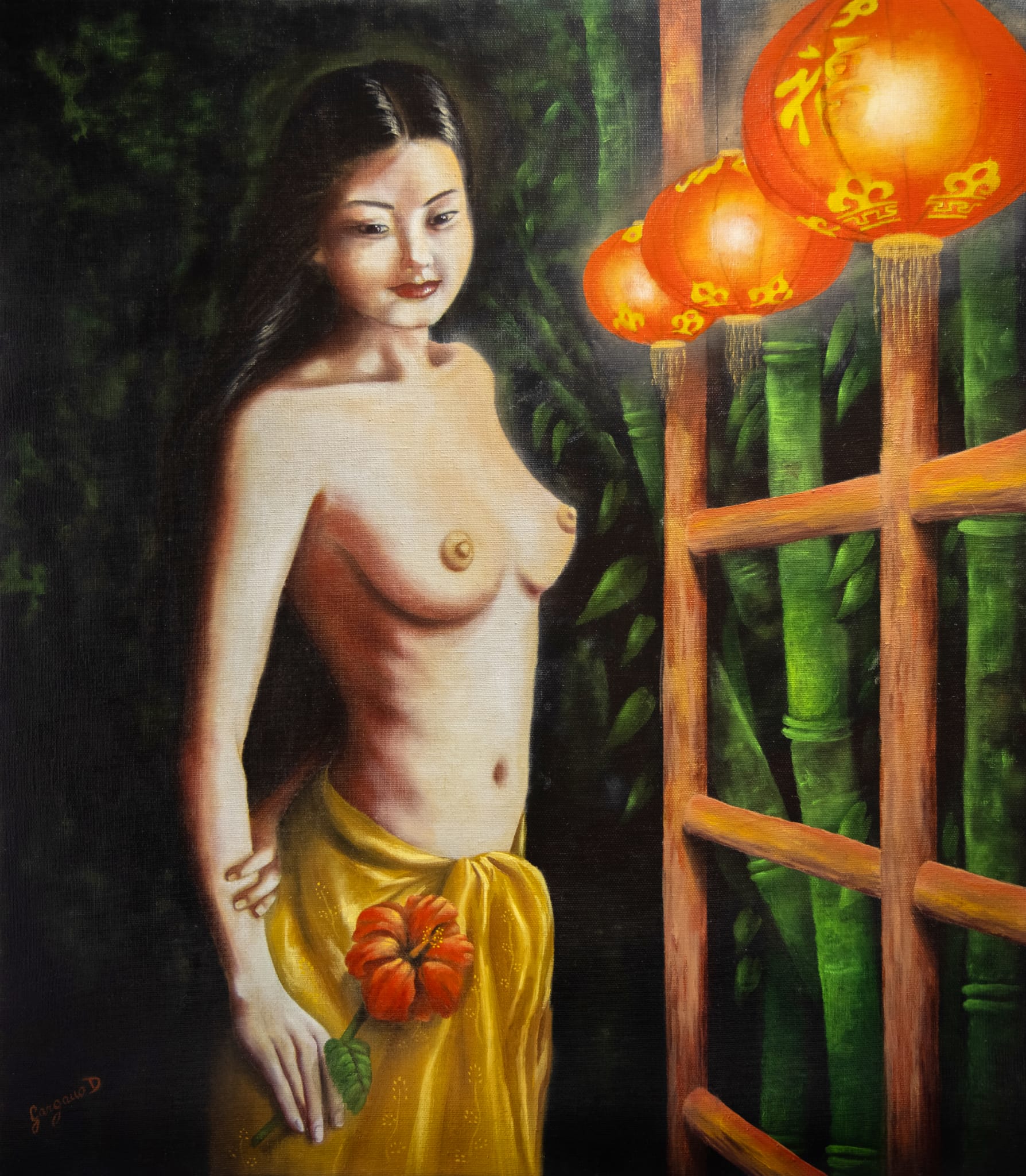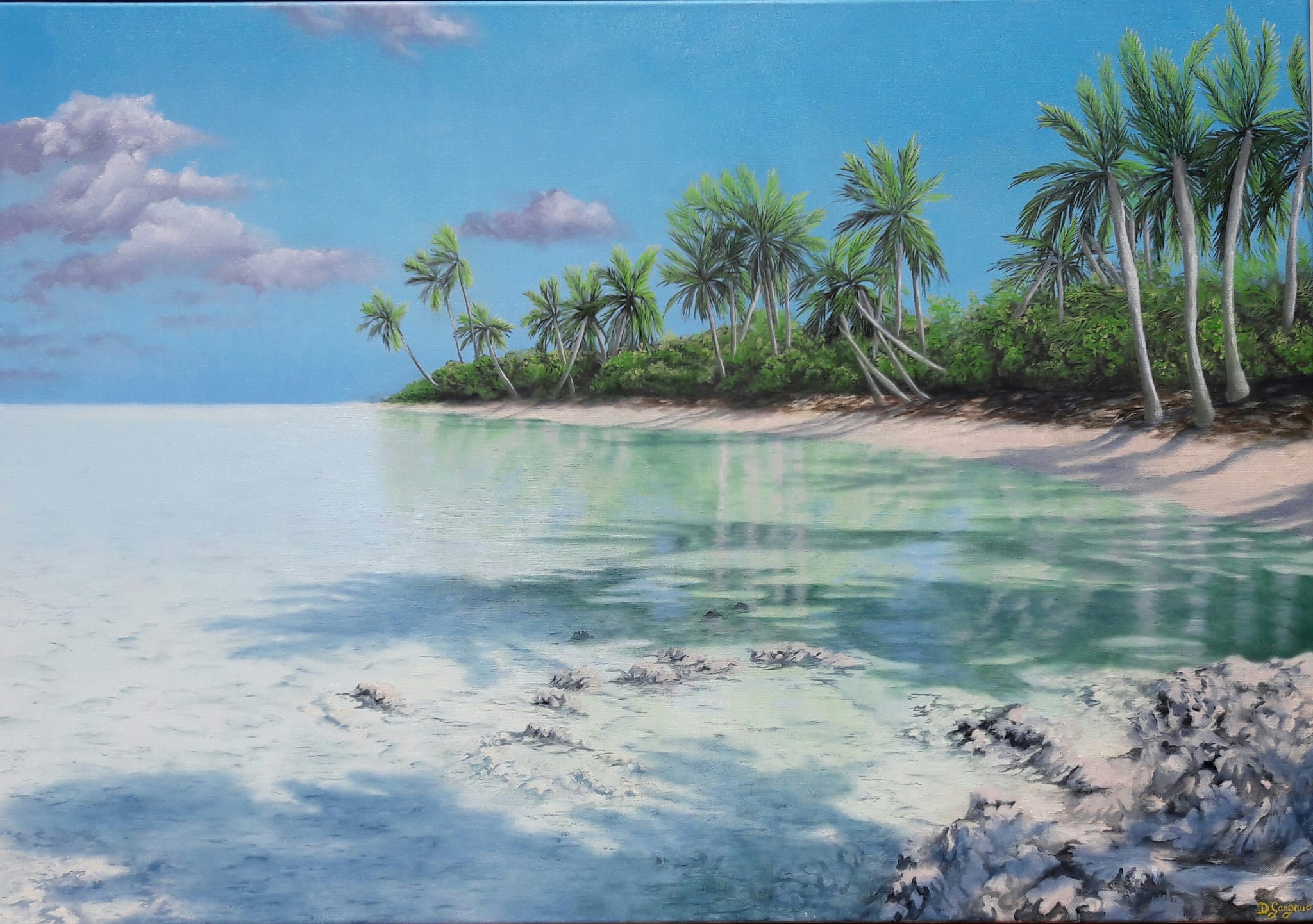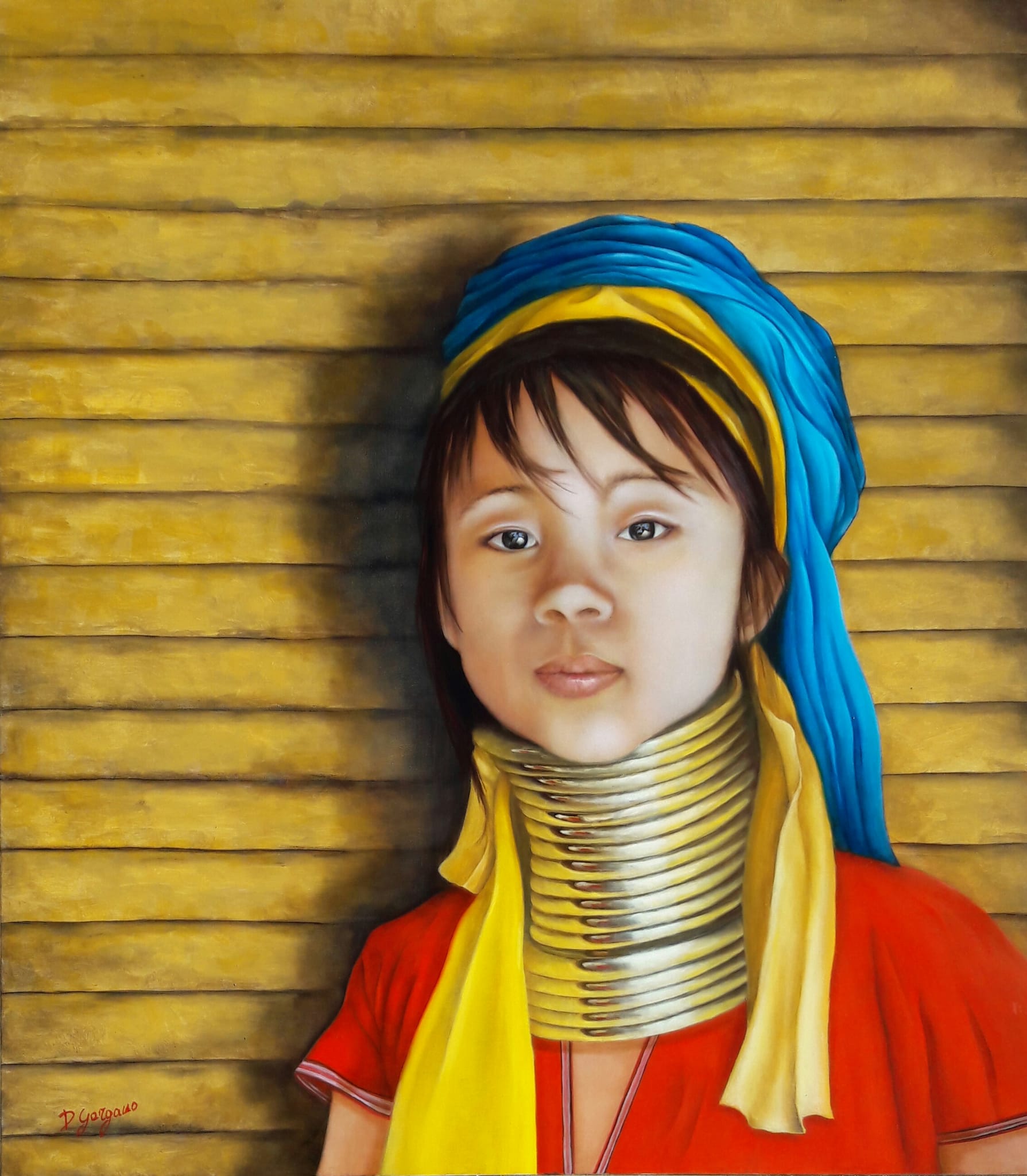 Nascono così interessanti rapporti tra i temi analizzati dalla pittrice e il desiderio di calma interiorizzata come risposta alla follia di questi tempi pesanti e cupi, quasi una alternativa alla ferocia dilagante attraverso gli strumenti universali del colore, dell’armonia e della forma; porti sicuri in cui la Gargano prova a trasportarci tutti indipendentemente dalla nostra curiosità attraverso la propria idea di luce e di composizione. Sorgono così paesaggi e vedute più o meno antropizzati, architetture di “confine al tempo” come i templi di Selinunte o la Casa Florio ai quattro Pizzi; e ancora veri e propri fermo-immagine a scala quasi al vero in cui i pappagalli delle fasce tropicali posano all’interno di una rigogliosità vegetale che forse oggi nemmeno esiste più, ancora volti di donne immote ma parlanti. Tutti condividono un pezzo di dna comune che, oltre l’ovvietà della mano dell’autrice, ritroviamo proprio nell’idea e nel concetto personale di “viaggio”, inteso come momento di sublimazione della propria curiosità antropica per costumi e società spesso assai distanti dalla propria cultura tipicamente mediterranea. Ne è forse emblema di maggiore richiamo la sua Donna giraffa Kayan del 2020, soggetto reale e dalla stessa Gargano incontrata, fotografata e scelta, una delle ultime autentiche donne birmane a utilizzare gli anelli a cingere il collo come elemento decorativo/strutturale di matrice culturale identitaria. L’artista avverte tutta la bellezza e la tragicità di un segmento di cultura popolare che va scomparendo davanti il “progresso” che avanza, dunque decide di indagarne la natura più intima attraverso la superficie pittorica, mediando luce e colore come elementi narrativi a cui affidare la purezza del ricordo e l’armonica spiritualità del giovane soggetto. Suggestivi e intrisi di una felice resa che non è mera tecnica, appaiono il Monte Pellegrino e la Fakarawa Atoll – Polinesia Francese, entrambe opere di matura lettura e di raggiunto equilibrio compositivo, alla stregua del paesaggio marino che ha come fondale la bianca marna della Scala dei Turchi agrigentina, dove quei giochi di luce rifratta sulla superficie marina ricordano le elicoidali provocazioni sinuoso-cromatico delle piscine di David Hockney. «Sono convinto – scrive Tommaso Romano – che la bellezza abbia un suo dipanarsi nelle cose, una sorta di menzione sulle emergenze del mondo che almeno ne sostengano un eco, anche flebile, un’immagine anche appannata », un dipanarsi che si nutre di percorsi e di figure eterogenee e uniche nella propria specificità identitaria, elementi organici di sintesi che calpestano porzioni di suolo distinti e distanti ma capaci di narrazioni locali e localizzate, forse la vera ricchezza di una globalizzazione perdente su tutti i fronti, tranne che su quello dello scambio sensibile di frammenti di bellezza che sappiano ancora contemplare, nel caos odierno, il rispetto reciproco come autentico valore umanistico. Ambasciatori del portato culturale dell’arte come medium di pace sono proprio gli artisti, e Daniela Gargano, nel suo tentativo di sintesi di narrazione per frame di normalità da rammentare, ognuno col proprio messaggio, tenta proprio di fare questo, di ricordare che la bellezza è sempre un messaggio positivo che prescinde il linguaggio e che è sempre capace di costruire un futuro migliore, sempre e comunque alternativo ad ogni rigorosissima e alienante forma di barbarie.