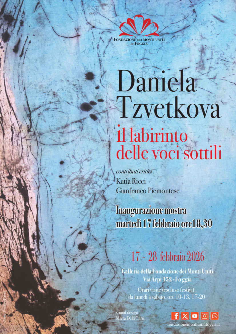 Sarà inaugurata martedì 17 febbraio 2026, alle ore 18:15 presso la sala “Rosa del Vento” della sede della Fondazione dei Monti Uniti, in via Arpi 152 a Foggia, la mostra personale di Daniela Tzvetkova, intitolata “Il labirinto delle voci sottili”, che si avvale del contributo critico di Katia Ricci e Gianfranco Piemontese. All’inaugurazione saranno presenti l’artista, il presidente della Fondazione, Filippo Santigliano, e i critici d’arte Katia Ricci e Gianfranco Piemontese. La mostra resterà in allestimento fino al 28 febbraio 2026 nella galleria della Fondazione e sarà visitabile dal lunedì al sabato, esclusi domenica e festivi, dalle ore 10 alle 13 e dalle 17 alle 20.