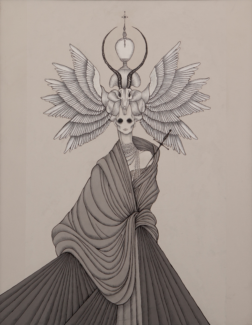 In particolare, Davitti si appropria del costume e della cultura dell’Inghilterra vittoriana a cavallo tra i due secoli, così estetizzante e cupa a un tempo, animata da un marcato eclettismo che egli ripropone ed espande, includendo ornamenti e attributi simbolici di derivazione asiatica e oceaniana e adottando la tecnica calligrafica tipica del Sol Levante, dalla cui tradizione culturale Davitti desume, inoltre, la visione wabi sabi dell’esistenza, basata sull’accettazione della transitorietà.