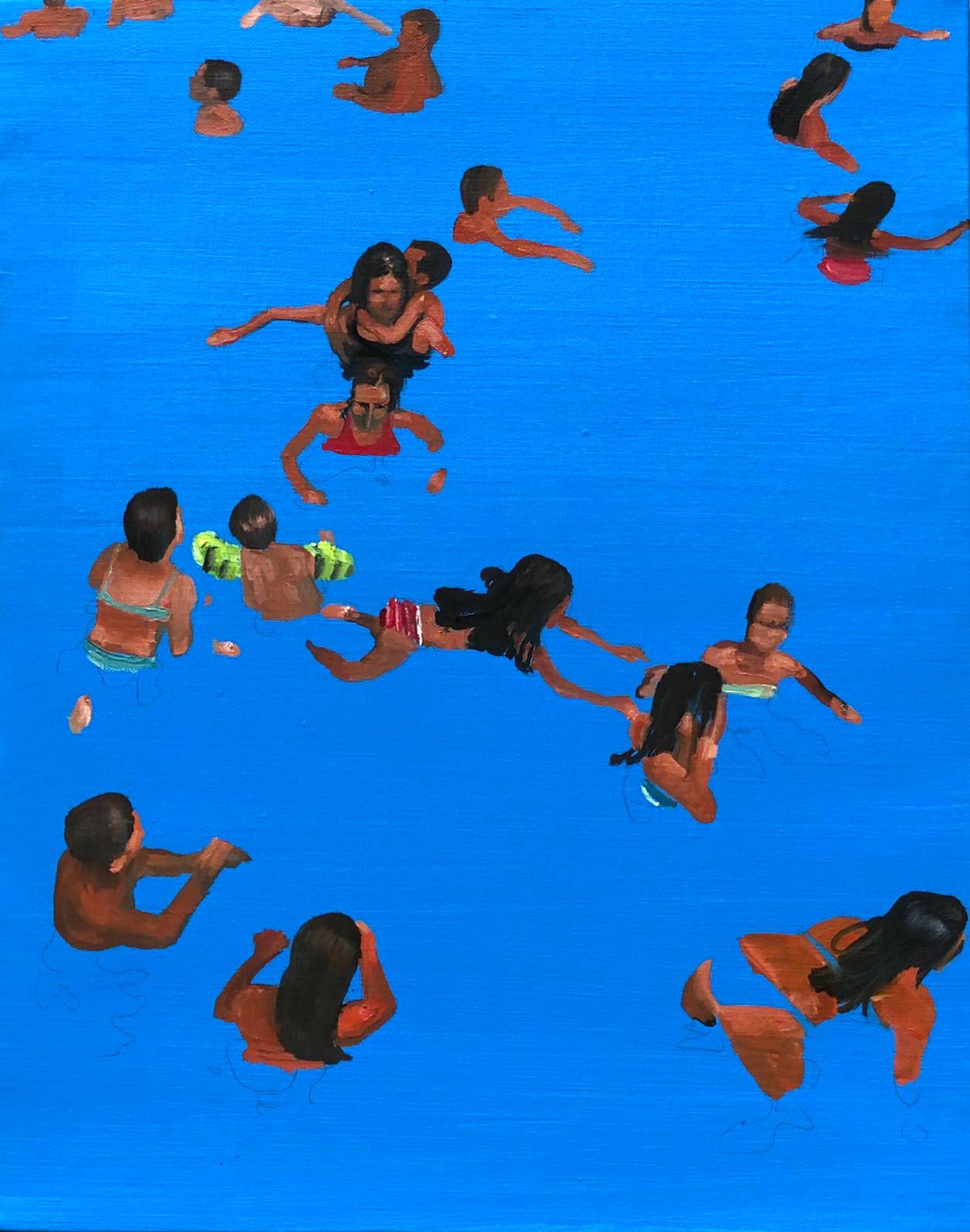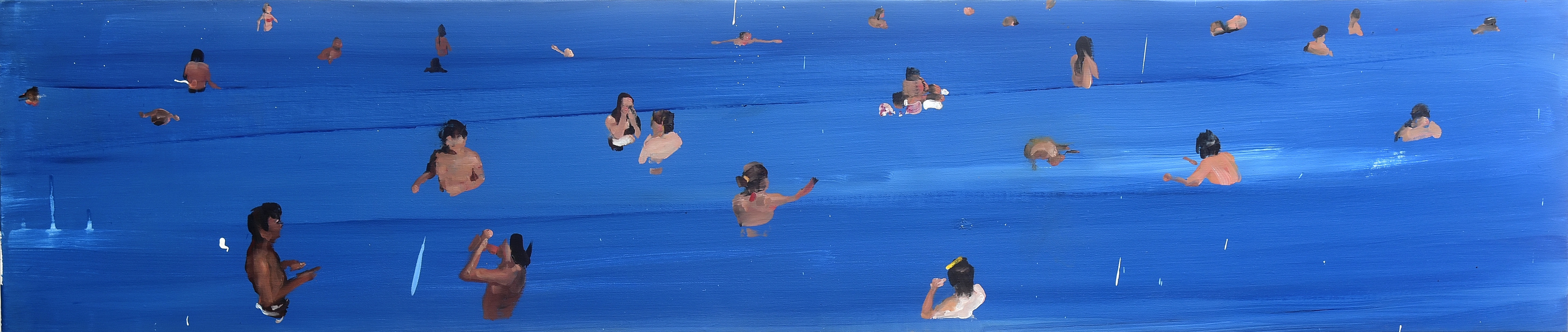 La pittura fotografica di Daniele Galliano ne “Una pazza felicità” continua a sondare ed esplorare la folla, la sfera collettiva di un rito, il piacere di abbandonarsi ed immergersi nella natura. I protagonisti si muovono e fluttuano nel blu del mare o si lasciano lambire dalle cascate fumanti, raccolti in piccoli gruppi o isolati. Ritratti rubati al privato, paesaggi, scorci da album fotografici che sembrano ispirarsi alla memoria di ciascuno di noi.
