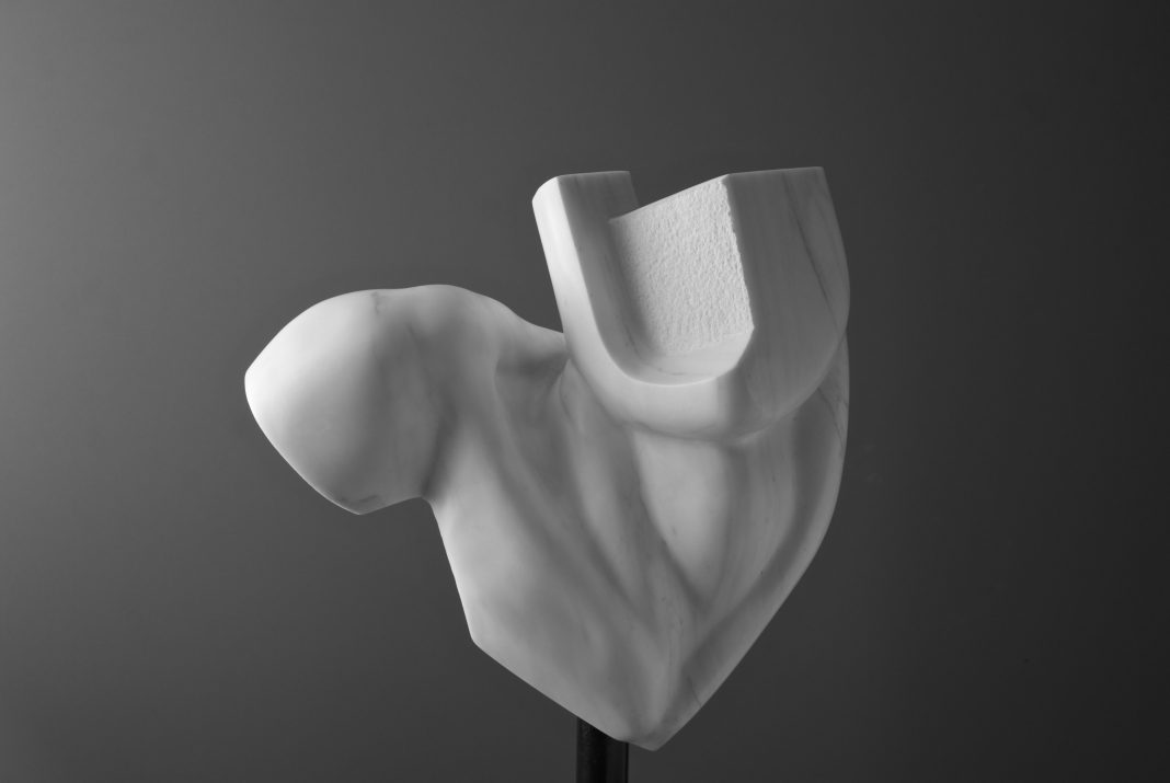 Guidugli da anni indaga e studia il corpo umano con particolare attenzione all’anatomia. Ma i suoi busti virili non sono la rappresentazione in senso stretto della figura umana, bensì frammenti di corpo in eterna tensione, in una ossessiva torsione quasi a volersi liberare dalla materia che li costringe.