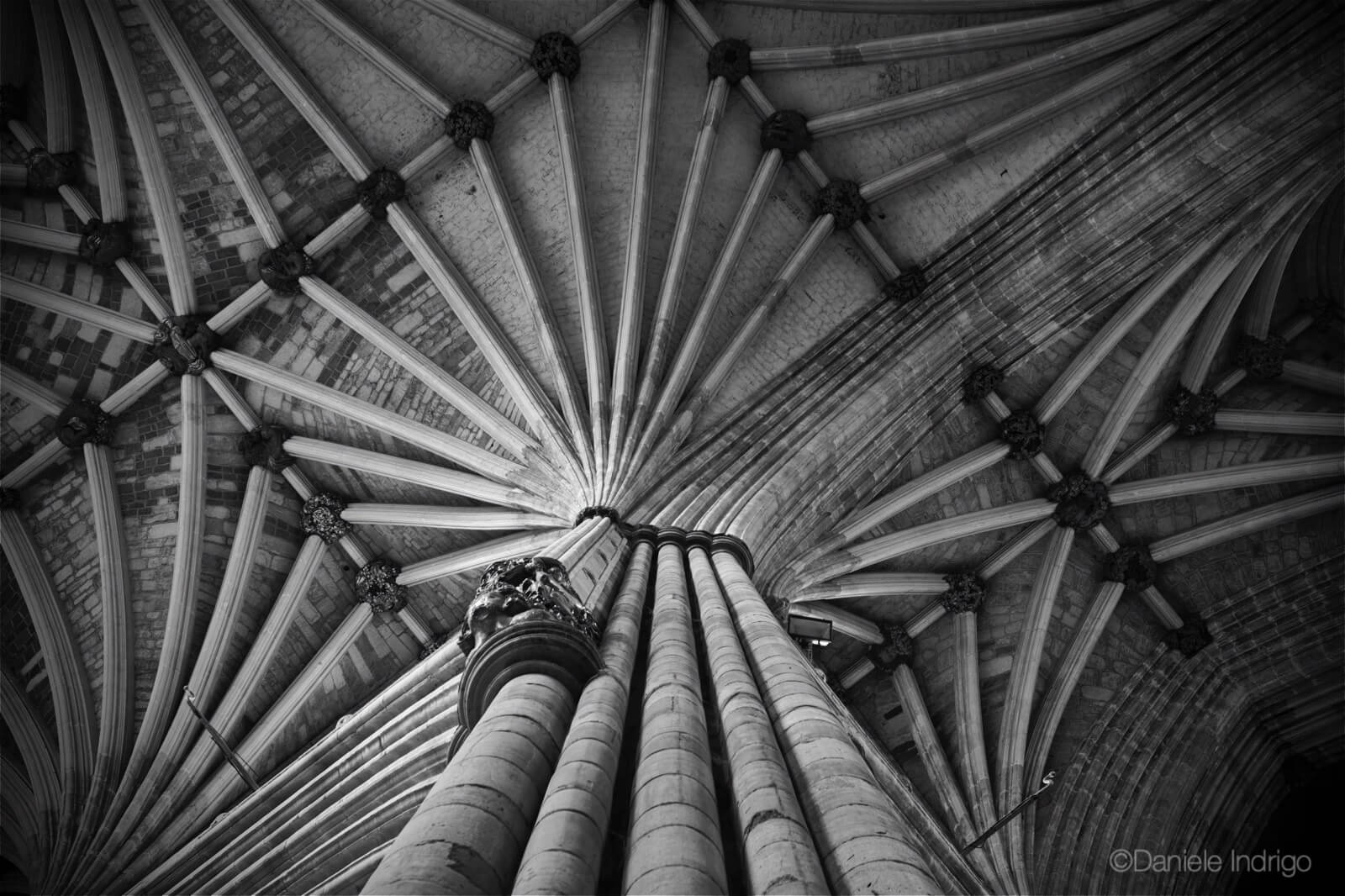 Il Gotico Internazionale si esprime con le forme allusive, metaforiche e simboliche, legate tra loro da “contrappunti”, come Indrigo stesso li definisce. Nel percorrere le navate di questi edifici monumentali, sembra infatti di immergersi nelle atmosfere di un salmo Gregoriano, tra gli echi di antiche mura conventuali. La scelta di fotografare esclusivamente gli interni di questi luoghi acquista dunque un significato coerente: capitelli e nervature, i trafori delle grandi finestre istoriate, ci parlano di una Natura Madre rigogliosa in un Universo finito, retto dalle regole della geometria medievale, come nei chiostri dei monasteri benedettini.
