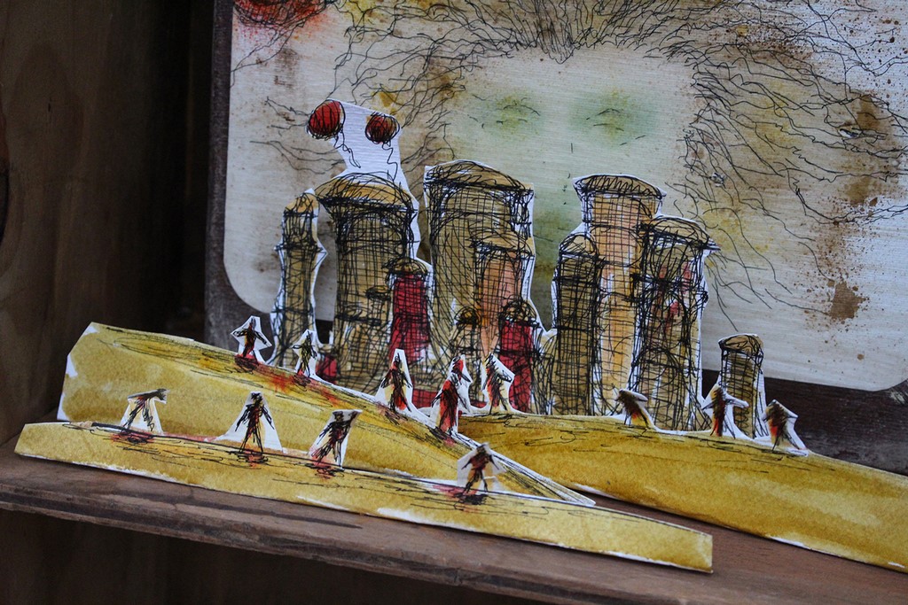“Machina Birotularis Theatralis” è la scenografia animata della performance. Alta più di due metri, conterrà un rullo di carta illustrato che verrà srotolato durante lo spettacolo e racconterà visivamente i passaggi della storia in totale sincronia con il flusso della recitazione attoriale. Lo stile medievaleggiante, arcaico, meccanico, con un tocco futuristico, è parte dell’epica di Lunghini e di una ricerca che attraversa i segni del tempo. “La Biblioteca delle Mappe” è, invece, una vera e propria libreria, che contiene memorie di viaggi e di esploratori: micro-scenografie incastonate in tavole di legno.
