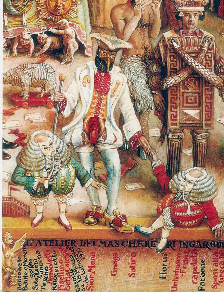 Scarpa Kos le associa a figure teatrali bloccate nella caricaturale fissità di maschere; globalizzazione e neocolonialismo culturale ne hanno esasperato le funzioni restituendole come ridicula difformitas di una galleria di personaggi parte di una drammaturgia recitata da musei, collezionisti, gallerie, curatori, critici, artisti: anch’essi non più soggetti-attori del sistema dell’arte, ma comparse della Sistema dell’Arte. L’istallazione insinua nello spettatore la sensazione di trovarsi in un negozio di specialità veneziane, come un turista a caccia di souvenir. Un’operazione metaforica che, davanti ad un rosso sipario di velluto, si chiude con alcuni frammenti del dipinto realizzato da Scarpa Kos e Giorgio Spiller nel 1993.