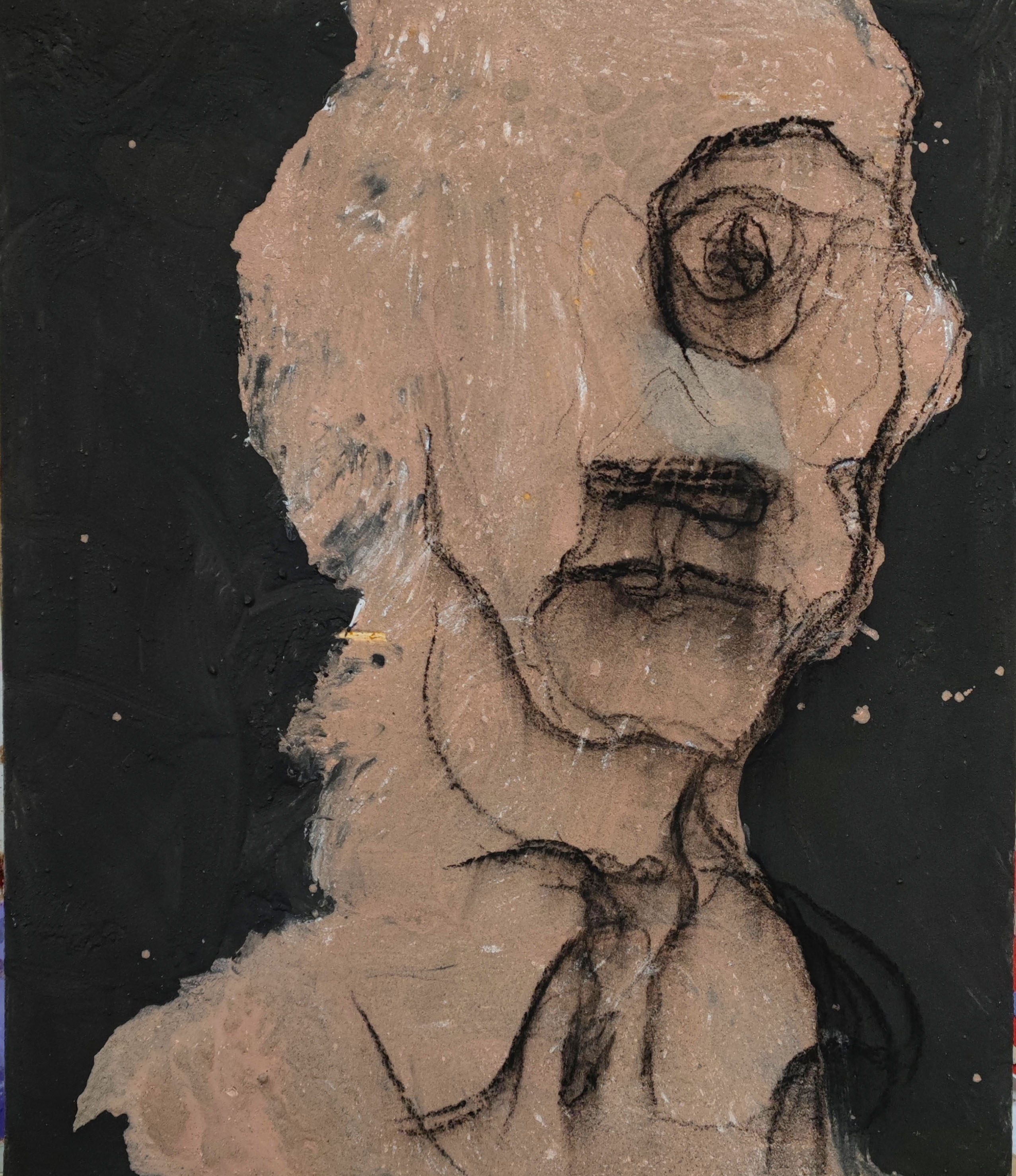 Da una parte visi trasfigurati, un'autocritica che sembra sgretolare l'identità sotto il peso del proprio sguardo interiore. L'occhio, dettagliato e incisivo, diventa il centro narrativo: osserva e condanna, simboleggiando il tormento dell'autovalutazione. L'aspetto materico e la distorsione formale amplificano il senso di conflitto interno, richiamando l'impossibilità di sfuggire a sé stessi.