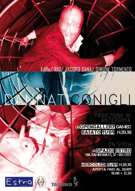 DANNATI CONIGLI raccoglie una parata di evoluzioni performative apparentemente contrastanti, le quali in realtà tracciano una precisa parabola attraverso il tema della scelta del fare arte e della sfida mai vinta tra l’intenzione e la sua soddisfazione. La sovrapposizione delle scene, spesso indipendenti da una reale traccia cronologica, unitamente a una ricercata esasperazione di toni allucinanti, sono state scelte come strumenti per indebolire la traccia narrativa a favore di un humus sensoriale disorientante: come immersi in una vasca, ci si ritrova premuti in un liquido vivo che ci comunica qualcosa di ovattato e impreciso, che possiamo cogliere solo a tratti e che per il resto della proiezione trattiene lo spettatore nello sforzo di tradurne il messaggio. Ci si ritrova a quel punto storditi dal carico di stimoli ricevuti, al quale ci si è potuti ancorare in più di un’occasione, senza però agguantarne del tutto il senso. Senso che i quattro artisti vorrebbero plasmarsi sui frammenti rimasti tra le mani degli spettatori. L’invito è quindi quello di non porsi verso l’opera ricercando una qualsiasi affermazione risolutiva, bensì concentrandosi su ciò che di essa rimane, nell’intenzione di affermare l’interpretazione del fruitore come elemento portante e conclusivo del tema affrontato.