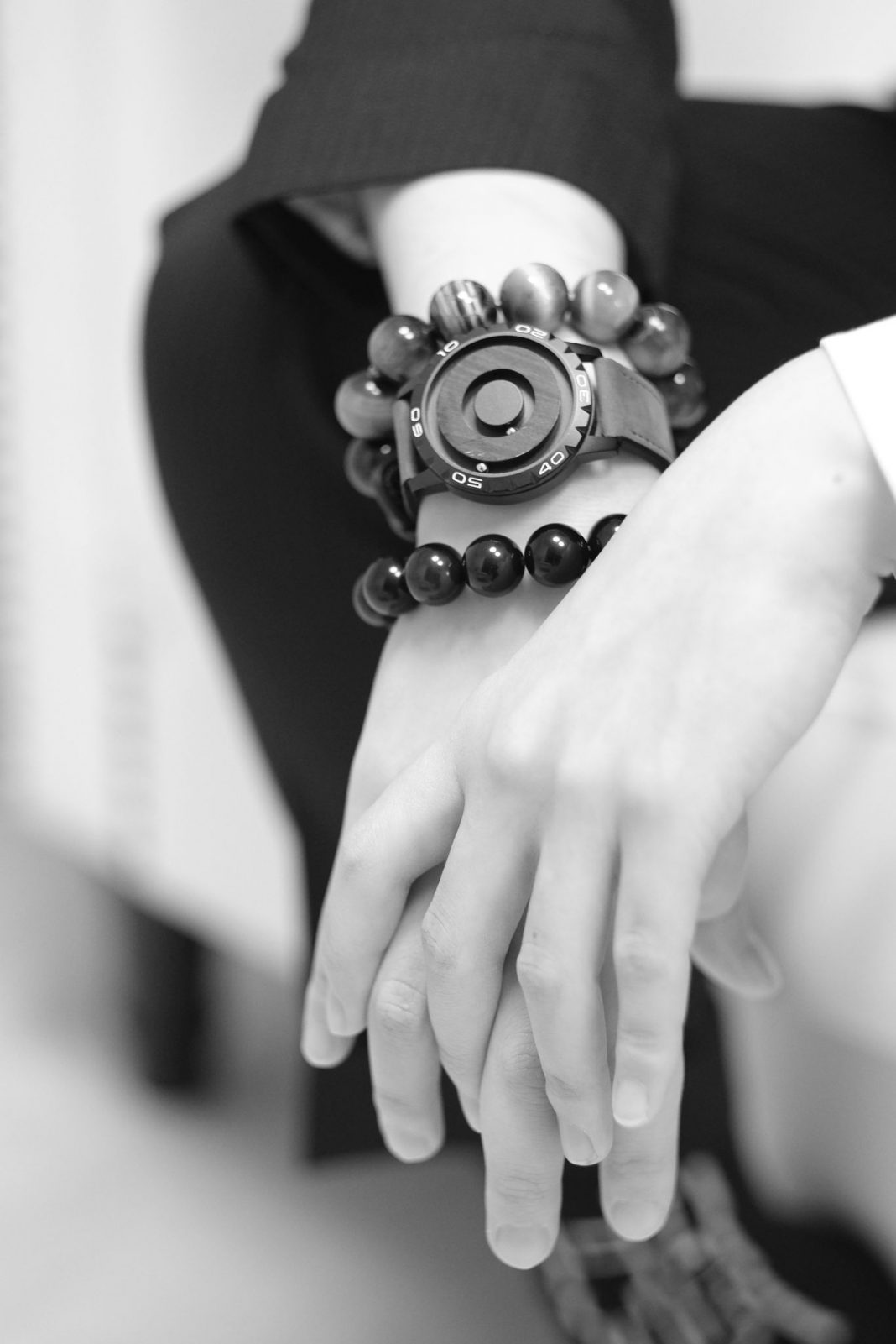 L’immagine della locandina è riassuntiva di tutta la narrazione della mostra: due mani si stringono, ma una è adornata da un orologio a sfere che consente di misurare il tempo senza guardare il quadrante, rimanda al tempo a pagamento dei dansō.