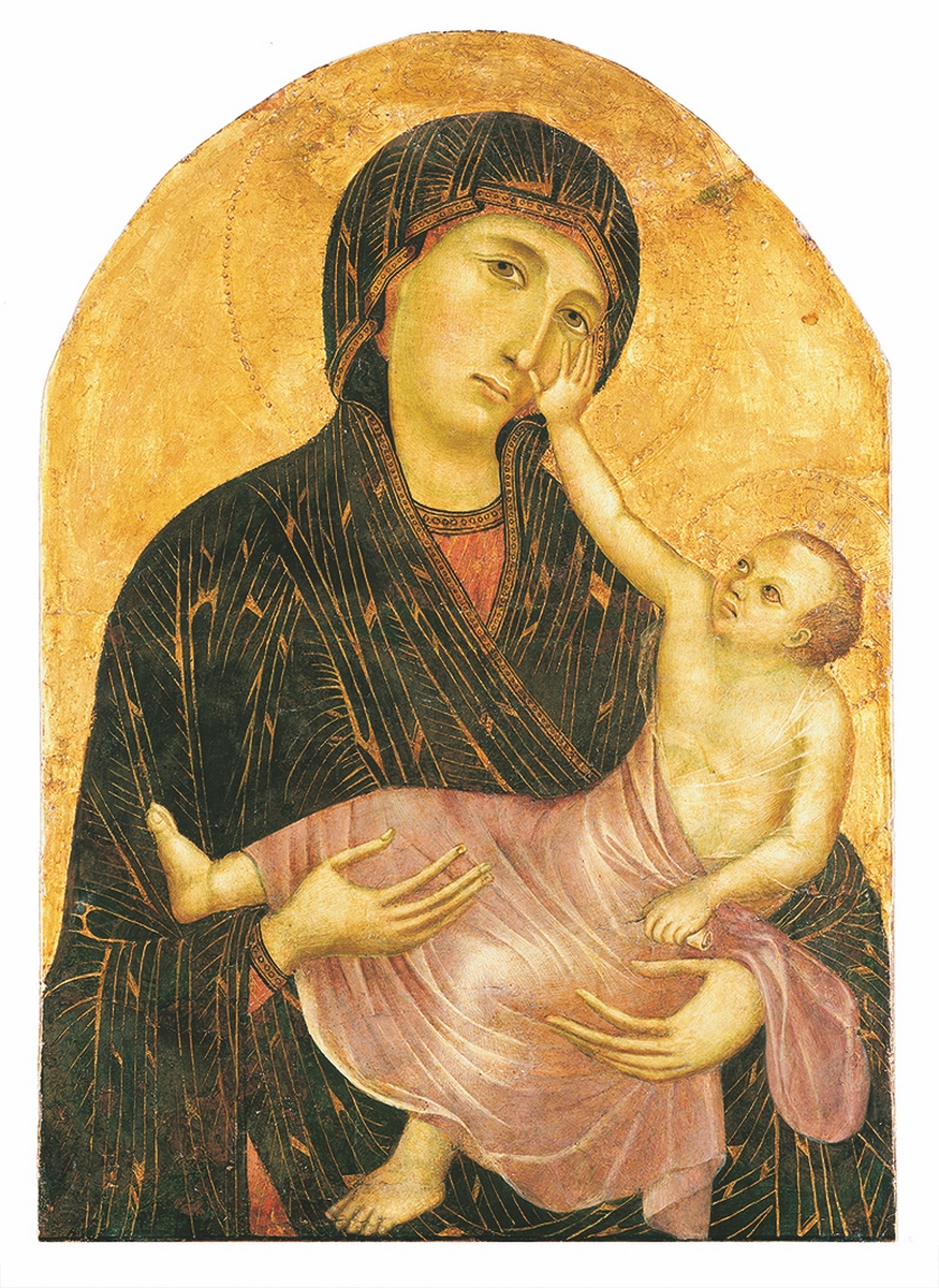 La mostra prende l’avvio da eccezionali documenti figurativi, provenienti da Firenze e Castefiorentino: la “Madonna con il Bambino” di Cimabue, con il più che probabile intervento del giovane Giotto, e il “Santo Stefano” eseguito da Giotto negli anni della piena maturità, tra il 1320 e il 1325, quando in contemporanea è attivo a illustrare le vicende di “San Francesco” nella Cappella Bardi a Santa Croce. A questi sono associati un considerevole nucleo di dipinti a fondo oro, la cui realizzazione si colloca negli anni della vicenda biografica dantesca e giottesca, provenienti dalla Collezione permanente, ad iniziare dal “Compianto” di Lippo di Benivieni, compiuto a Firenze allo scadere del XIII secolo, per giungere al malinconico “San Giovanni nel deserto” del più abile tra gli allievi di Giotto, il raffinato Bernardo Daddi.