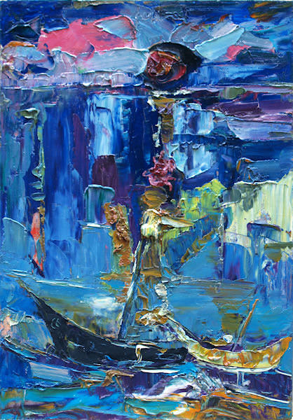 Per ora, nell’ambito degli inediti, accanto ad altri Nocchi Fioriti, compaiono in mostra dipinti appartenenti alla serie delle Strutture, (prossima, anzi temporalmente contigua, ma deliberatamente ben distinta dal coevo filone dei maestri dell’astrattismo) e a quella dei Tramonti, articolati ed abbinati a fiori, relitti e barche. Anche in questo caso magistralmente trattenuti sulla soglia della dissoluzione ‘informale’.