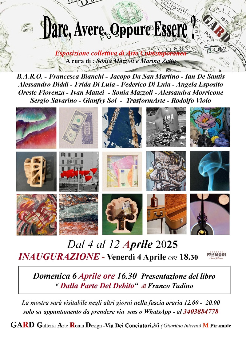 La Galleria Gard presenta dal 4 al 12 aprile la prima edizione della mostra "Dare, Avere. Oppure Essere?" un progetto di Marina Zatta centrato sul libro "Avere o Essere" di Erich Fromm. La mostra si pone come momento di riflessione sul senso e sulla destabilizzazione umana e del pianeta provocata dall'utilizzo del Denaro nella società dei consumi.