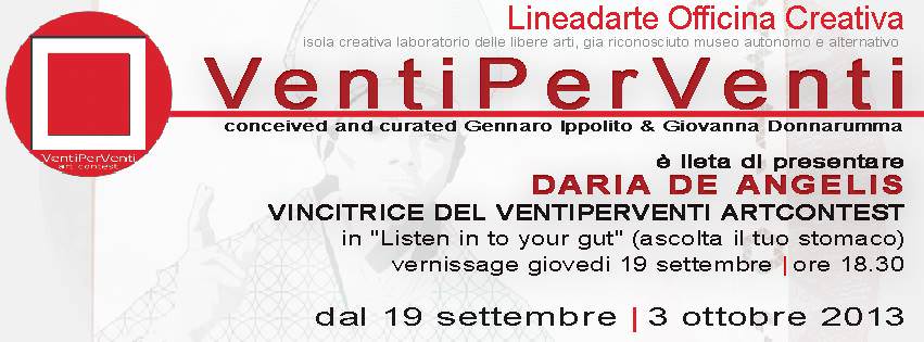 Giovedì 19 settembre 2013 alle ore 18 presso Lineadarte Officina Creativa inaugura la mostra-premio del Ventiperventi Artcontest “Listen in to your gut - ascolta il tuo stomaco “della giovane creativa napoletana Daria De Angelis vincitrice del contest con l’opera Iett’o sang.
