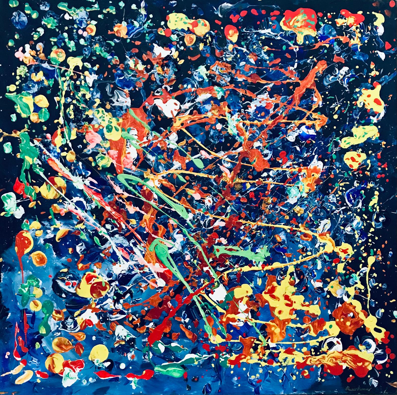 Le 50 opere su tela, che Bosano espone da GULLIarte , sono di pittura astratta, che si riferiscono a una rivisitazione dell’Action Painting americano, del secondo dopoguerra.
