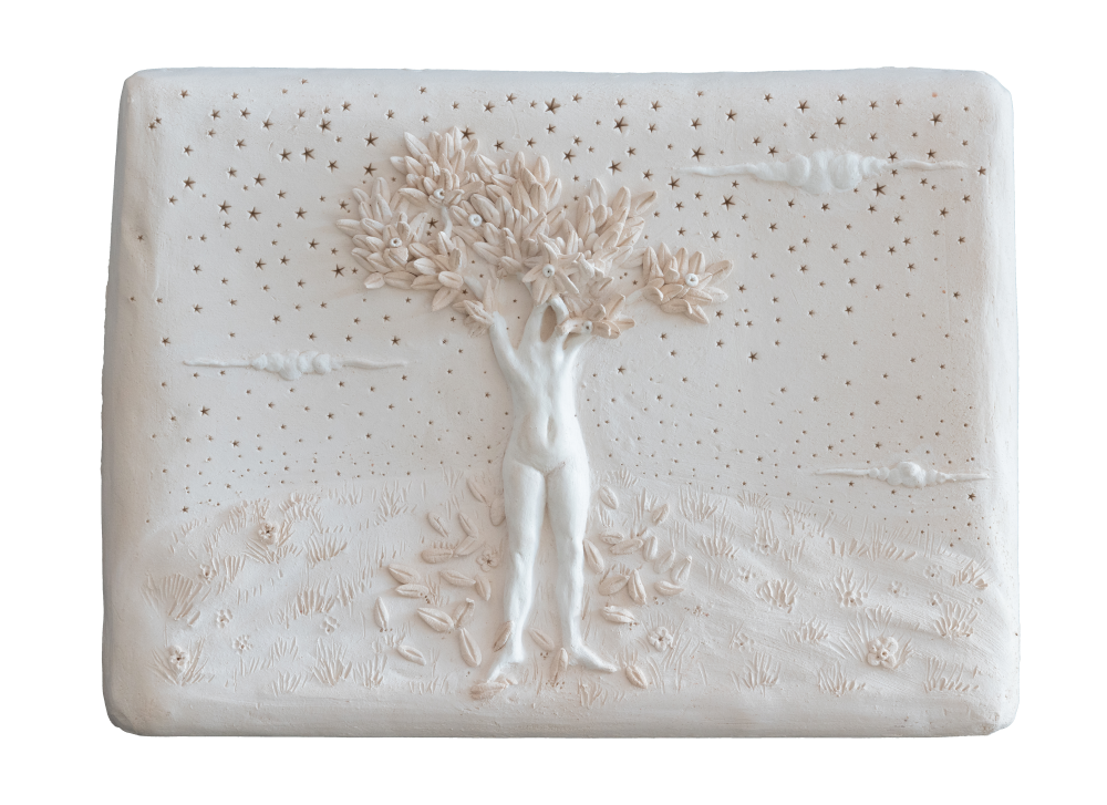 sulla superficie delle formelle si configura un paesaggio possibile ma addomesticato, nel quale la tecnica sviluppata dall’homo faber non serve al puro virtuosismo ma alla (re)invenzione della realtà. Le presenze mutanti vivono nel rapporto con un contesto silente perché atemporale e interiore, artificiale perché più che rappresentare riflette sul senso della rappresentazione e sul rapporto tra Uomo e Natura.