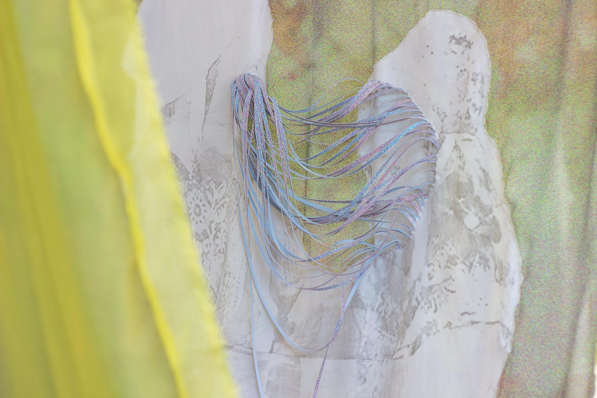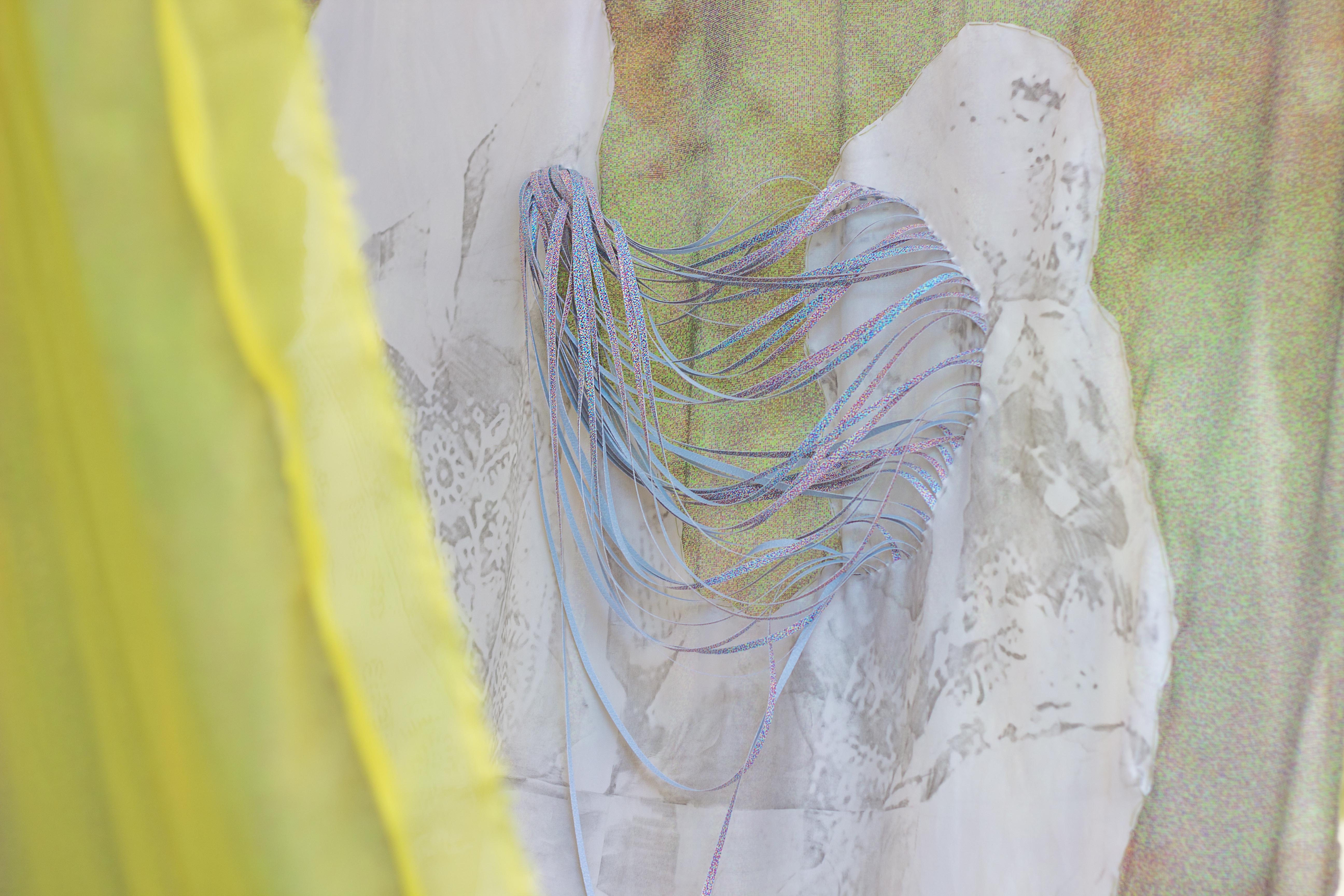 Gli interventi installativi, realizzati con diversi materiali e tecniche, sono messi in mostra grazie all’impiego di attrezzatura del backstage fotografico, come ombrelli o stativi. L’attenzione è rivolta al medium fotografico, ponte di unione tra il passato e presente: le immagini fotografiche vengono modificate digitalmente, trasferite con acidi su tessuti oppure stampate su carta blueback fatta a striscioline, per essere poi utilizzata per ricamare parole, secondo pattern decorativi di abiti cerimoniali o immagini naturali.