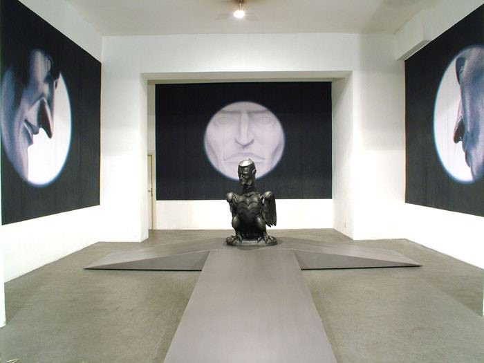Seguendo la sua ricerca dove la monumentalità è riletta attraverso un filtro di decisa matrice concettuale e attraverso una caustica componente di ironia, Fagioli costruisce così un ambiente concentrato su un'immagine metamorfica e misteriosa che assume un ruolo centrale nel contesto visivo e simbolico dell'installazione. L'elemento su cui ruota l'intero "sistema" della mostra perde dunque la sua "pura" essenza di oggetto-scultura per diventare il fulcro di una realtà parallela e allucinata, il cardine di un ambiente completamente ricostruito e trasformato dall'intervento dell'artista, in un'opera da cui gli spettatori sono in qualche modo "assorbiti" per essere calati in uno spazio dominato da uno stridente senso di allarme e di emergenza.