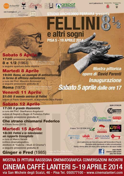 Il Cinema Ceffé Lanteri anche questo anno dedica il mese di Aprile alla figura di un grande cineasta italiano: Fedelico Fellini. Le celebrazioni del regista romagnolo si snoderanno attraverso una mostra pittorica e una rassegna di film con presentazioni di libri, conversazioni e letture