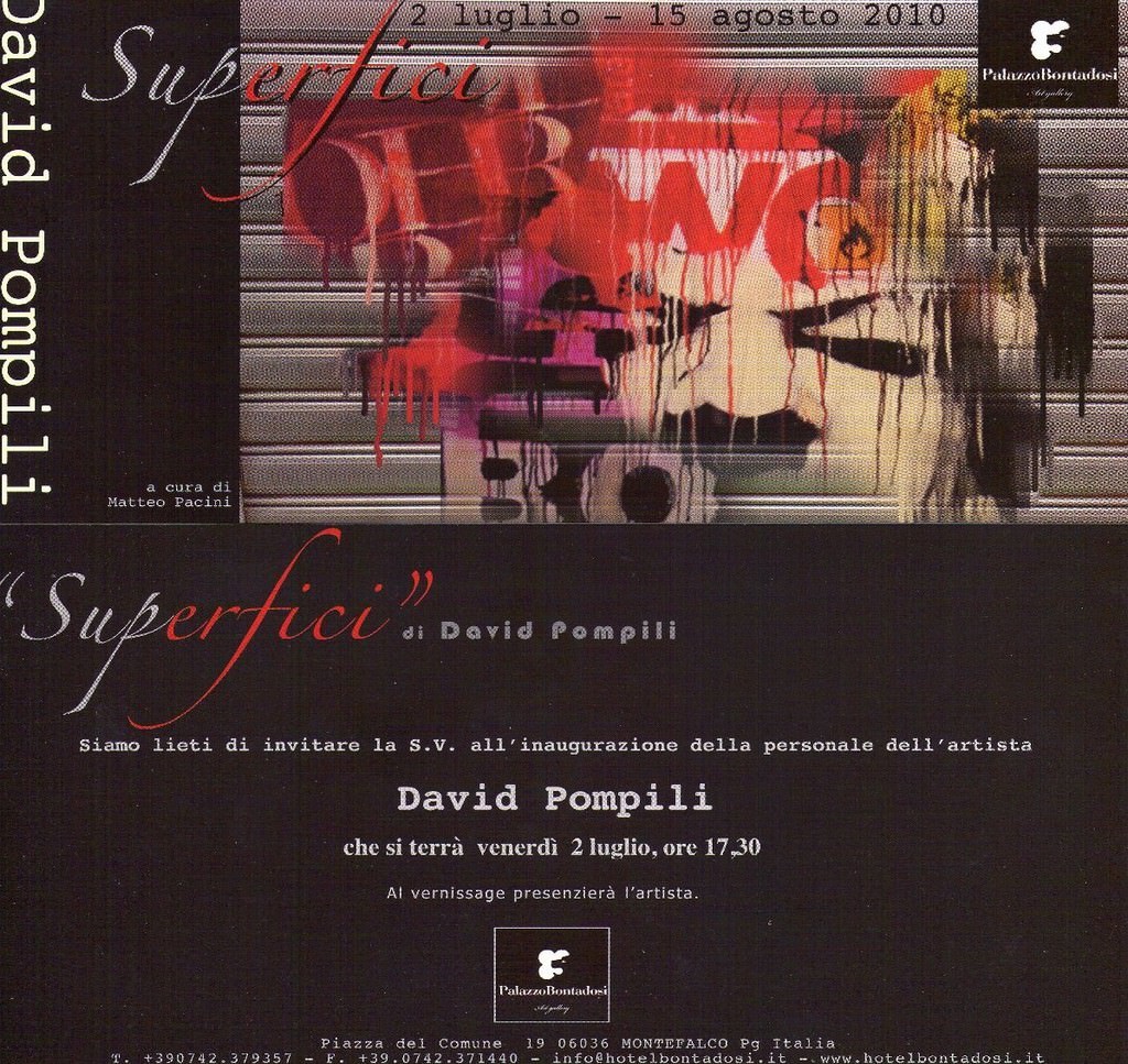 Ha inizio, venerdì 2 luglio 2010, presso i locali dell'ArtGallery di Palazzo Bontadosi Hotel & SPA a Montefalco, la personale dell'artista umbro David Pompili. L'esposizione, a cura di Matteo Pacini, sarà visitabile fino al 15 agosto, con ingresso libero e orario continuato dalle ore 10,00 alle 22,00. Pompili nasce a Spoleto nel 1970 e fin da bambino mostra un forte interesse per le forme espressive. Canonica la sua formazione: Istituto d’Arte di Spoleto, Facoltà di Architettura con specializzazione in Disegno Industriale e Accademia di Belle Arti. Dopo la collaborazione con alcune case di moda a Milano e Firenze si dedica anche alla scenografia, ma la sua più grande passione rimane la pittura. Nel maggio del 1999 partecipa a San Francisco ad una collettiva dove riscuote grande successo che si ripete nel febbraio 2000 a Chicago. Partecipa attivamente a diverse collettive tra il 2001 e il 2002 tra le quali CAVOUR ART a Terni. Per ben nove volte partecipa al Festival dei Due Mondi di Spoleto e nel 2008 fonda, insieme ad un gruppo di amici, l’associazione d’arte Contemporanea ARTEIFICIO che tuttora presiede. Oggi, oltre a dipingere, insegna storia dell’arte e si occupa di progettazione di interni e design nel suo studio di Foligno. Le sue opere vengono trattate in alcune delle principali gallerie Italiane ed Europee come la PIAZZA DELLE ERBE di Roberto Rossini a Macerata e la galleria AMART di Bruxelles. Numerose sono le esposizioni come ad esempio la personale dal titolo STRAPPI nello spazio espositivo di Santa Maria di Betlem a Foligno nel 2009, l’esposizione presso il VIDEOCENTRO di Terni nel 2010 e la personale presso la DADA gallery, sempre nel Folignate. Altrettanto numerosi sono i premi: Premio Città di New York (Gennaio 2010), premio D. FABIO LEONARDIS (Febbraio 2010 Terni), premio COMBATART (Livorno 2010) e la realizzazione di un’opera stabile in occasione del 20° anniversario del crollo del muro di Berlino conservata ed esposta al Museo Civico di Arte Moderna e Contemporanea VILLA COLOREDO MERTZ a Recanati (MC). Nelle tecniche miste, che l’artista propone nei sui dipinti, è palese il richiamo alla Pop Art che, reinterpretata in chiave moderna, mantiene come costante la denuncia sociale dei drammi attuali i cui piani comunicativi si confondono e si frammentano nella sovrapposizione fra messaggi pubblicitari e graffiti; tuttavia l’approccio ai temi è tutt’altro che di maniera.