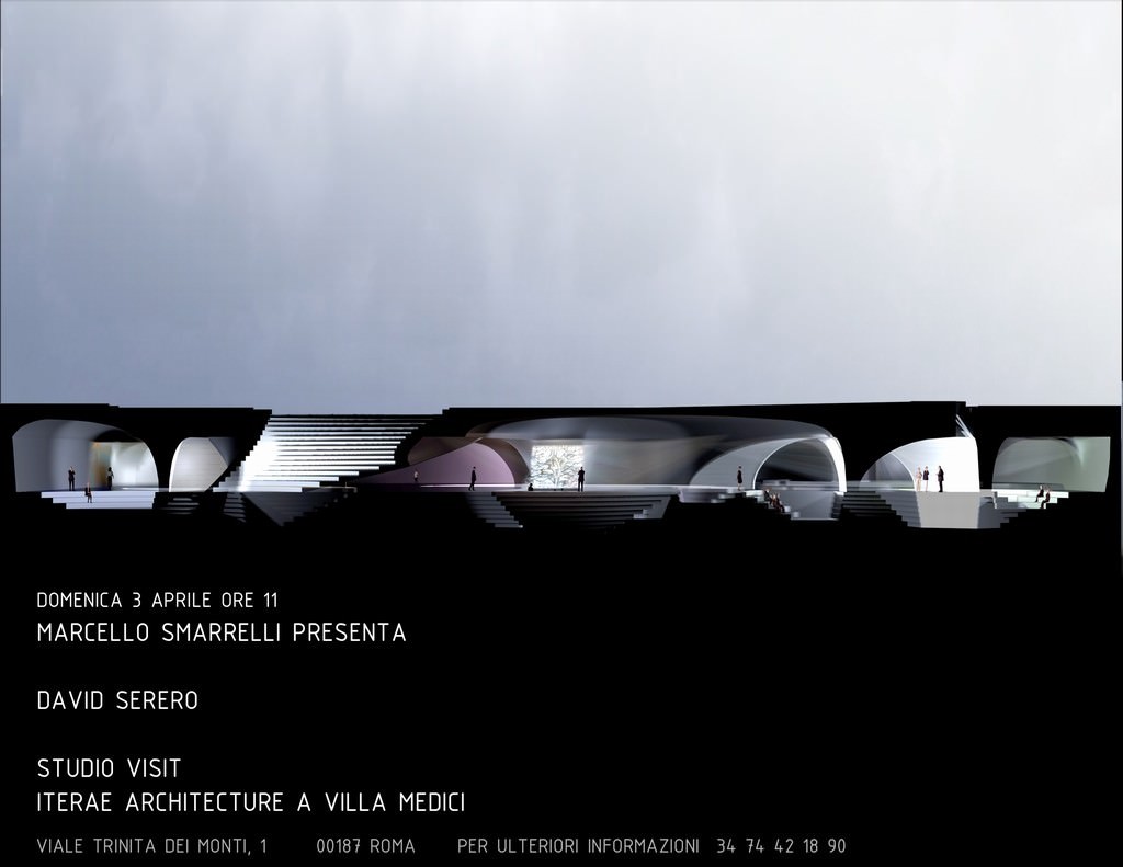 Serero presenterà i progetti in corso, tra cui il teatro di plein-air « Scale orography » un teatro/spazio di proiezione pensato come topografia artificiale di sedute che diventano una struttura effimera a configurazione multipla