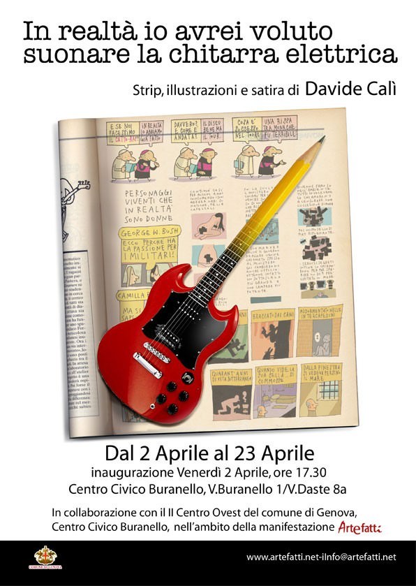 Nell’ambito della manifestazione “Artefatti” verrà inaugurata il 2 Aprile alle ore 17.30 presso le sale del Centro Civico Buranello di Genova, la mostra di Davide Calì: “In realtà io avrei voluto suonare la chitarra elettrica”, antologia di strip e illustrazioni satiriche dell’autore.