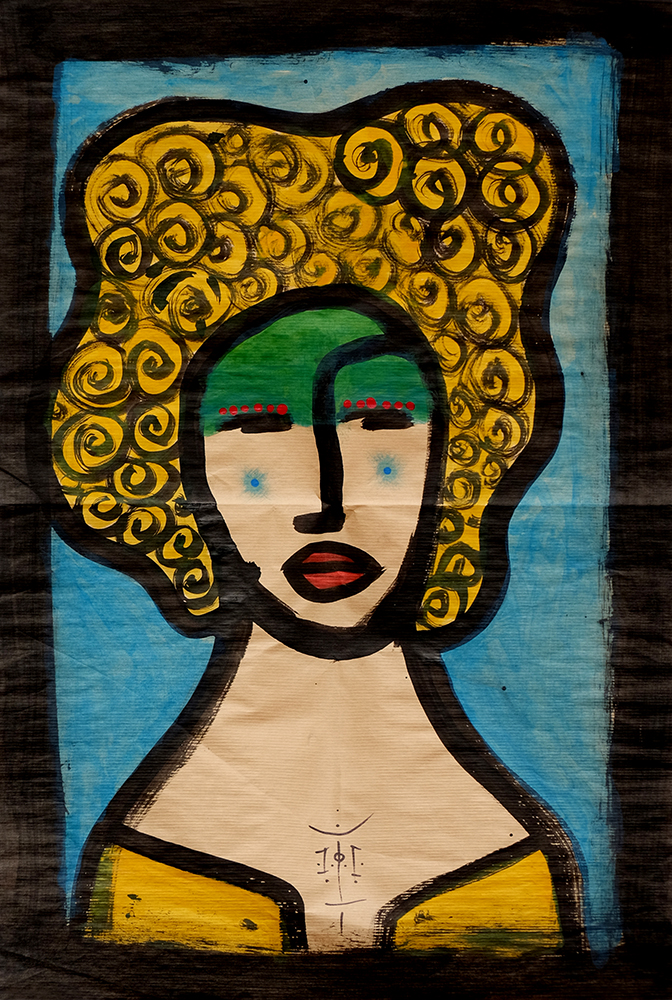 I supporti che preferisce vanno dalle carte stradali alle mappe della metropolitana, alla carta da pacco riciclata. L’importante è che i fogli possano essere piegati in modo che non occupino troppo spazio e siano facilmente trasportabili. Materiali poveri per eccellenza, che raccontano la loro storia cui Davide sovrappone la propria, attraverso una pittura gestuale all’inchiostro di china. Tracciati, intrecci, ritratti, i suoi lavori sono di grande potenza grafica. A volte i suoi personaggi sono innocenti, quasi infantili, a volte sono selvaggi, seri, comunque sempre ambigui. Hanno forza, carattere. Conservano tutta la gentilezza dell’artista, e allo stesso tempo sono potenti, risoluti, determinati. La linea intensa, il colore vivace, conferisce loro una grande forza espressiva. Spesso Cicolani aggiunge il lettering, iscrizioni in italiano o francese, o nella sua lingua, che è nota solo all’artista.