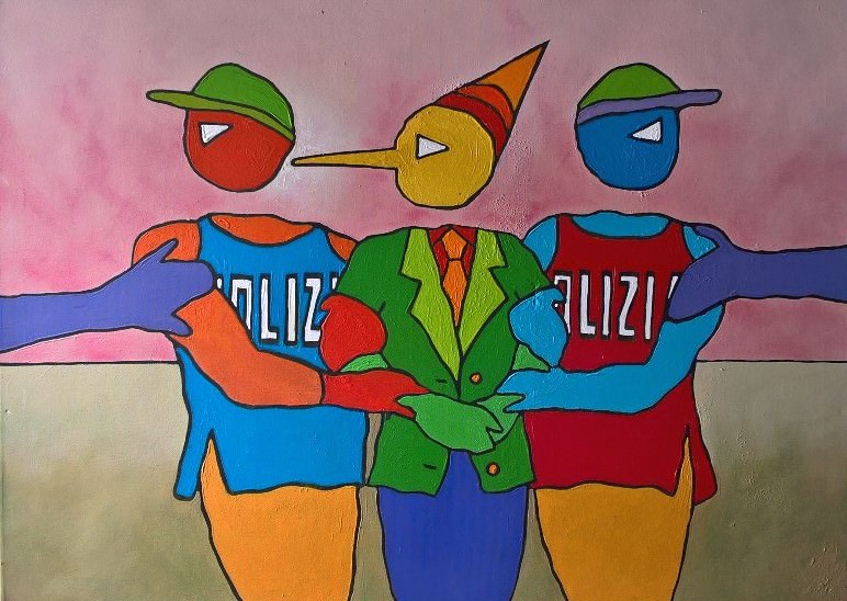 L'artista ritrae personaggi o animali mascherati, privi di testa, vuoti come fantasmi o personaggi tratti da citazioni di opere d'arte, caricature di se stessi. Le sue immagini sono un «rispecchiamento paradossale e distorto di un mondo – sono parole della Corgnati- in apparenza estraneo e fumettistico, ma che, in realtà, è proprio il nostro, le nostre città, i nostri rituali, la nostra falsa coscienza, le nostre convinzioni stereotipate e rigide, i nostri fantasmi e la nostra, parola calzante, superficialità».