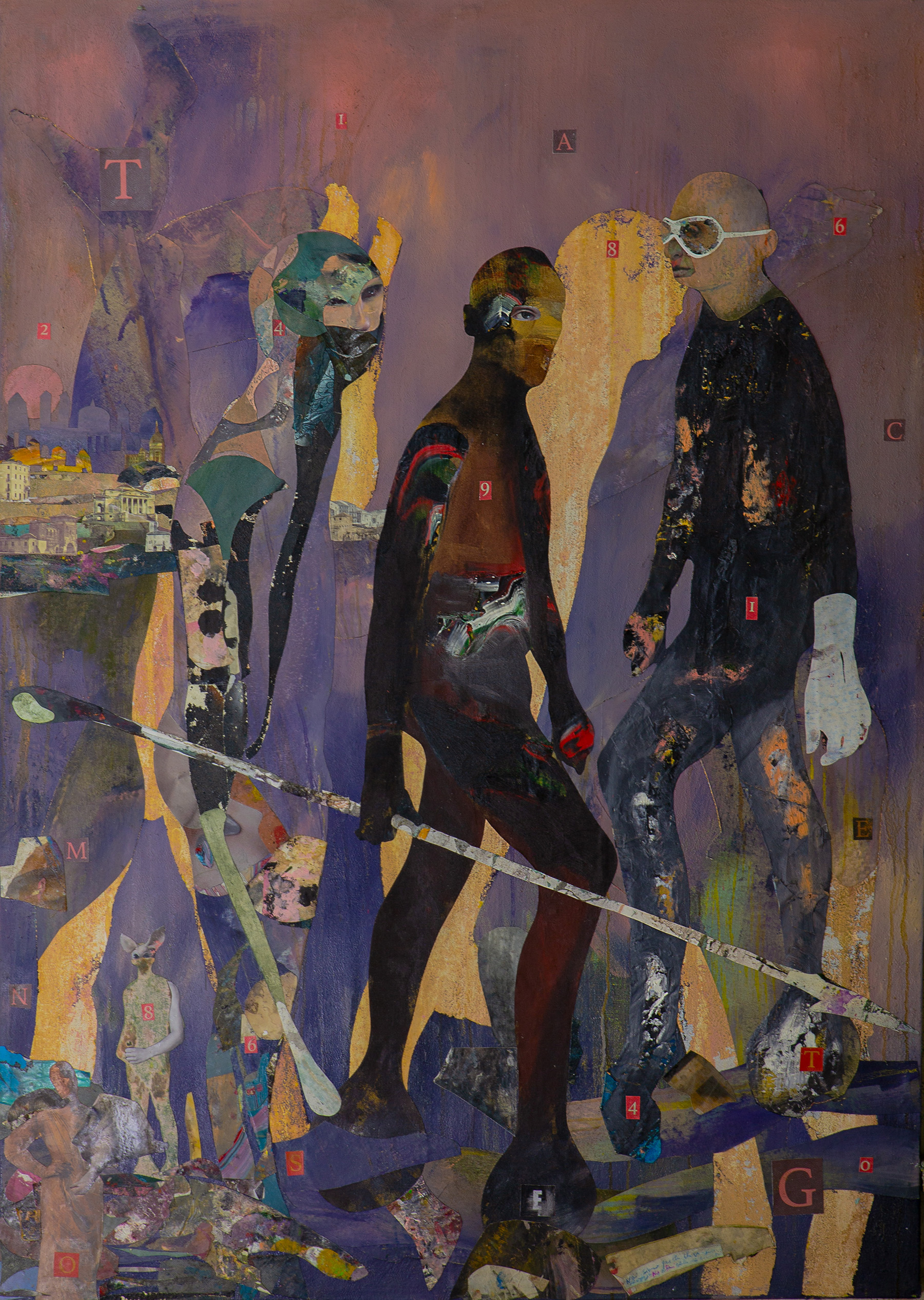 Poesia urbana attraversa idealmente i diversi movimenti letterari a partire dal romanzo cavalleresco quale simbolo di innovazione per la sua epoca, che utilizza la lingua volgare, appunto romanza, per comunicare a tutti e raccontare vicende d’amore e di lotta, di vita e di morte, in un contenitore di emozioni oltre che di valori senza tempo. Allo stesso modo le pitture di Davide Fioretta Falky indagano la società, la politica, gli usi e costumi dell’uomo contemporaneo, della realtà urbana in cui egli vive, con un linguaggio visivo diretto e di forte impatto, dove la figura umana vaga, si perde, va in cerca di se stessa nei meandri di una tecnologia che diventa ogni giorno più famelica di contenuti, di sovraesposizione, a caccia irrefrenabile di dopamina. È l’uomo che si consuma, che trasmuta divenendo la sagoma di un sé ideale, un involucro talvolta celato dietro un bianco e nero di pessimismo e nichilismo, in altri casi appariscente alla stregua di burattini in una fiera.