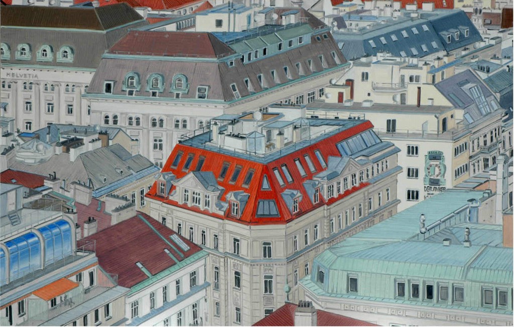 In mostra una quindicina di opere di vario formato e tecnica in cui l’artista partendo da scorci aerei di città sviluppa una composizione geometrica del paesaggio.