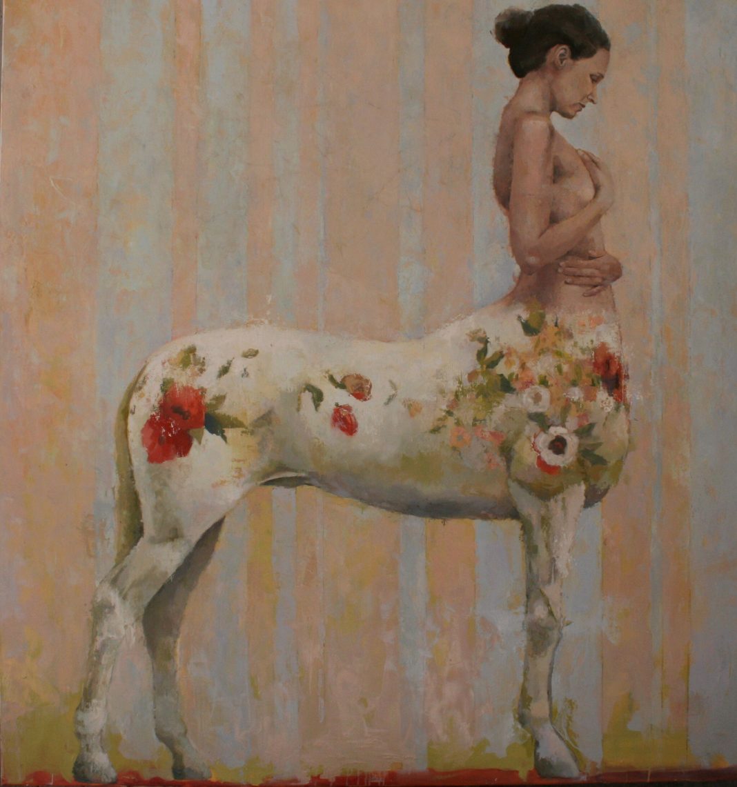 Lo sfondo a righe sembra quello di una casa di altri tempi ma la luce ci manifesta una donna che si aggiusta le calze in un gesto così antico che ricorda la plasticità delle veneri romane, né ci pare strano incontrare, accanto a un pesce fatto di fiori così bello che sembra volare, una centaura assorta nei suoi pensieri, personificazione della saggezza che domina l'istinto, immagine della forza ibrida dell'universo femminile che ci affascina e al tempo stesso ci spaventa nella sua coerente normalità. Un papier paint azzurro fa da sfondo alla mucca, anch'essa floreale, la luce abbacinante è la stessa, e io penso alle vacche bianche che popolano i pascoli di Francia e della maremma laziale, ad Athor e alle due madri di Segantini, anche i questo caso non vi è differenza tra essere umano e animale, pari è la loro dignità dinnanzi al mistero della pittura pura.