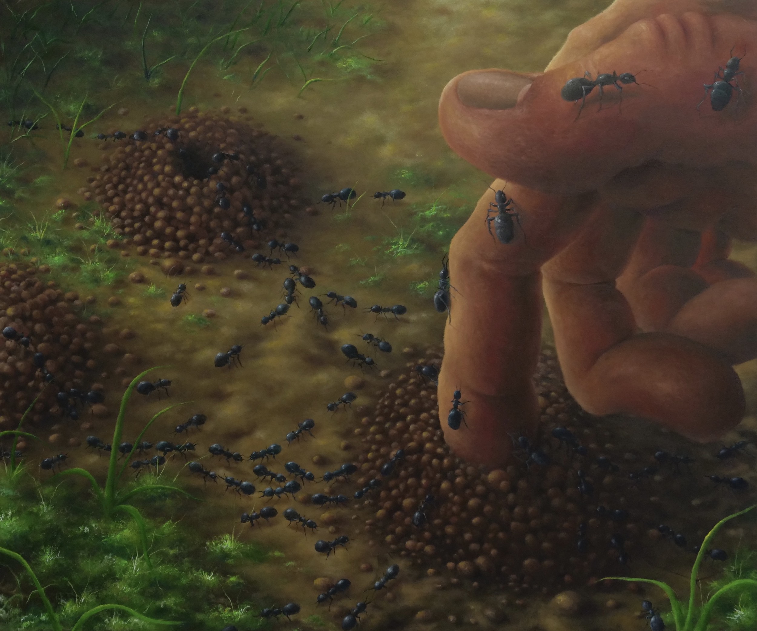 Le opere raccontano un’esistenza organica ed essenziale, un’indagine della terra, che divengono un’indagine dell’intimità umana, fatta di gesti semplici e lenti, amplificati da una narrazione contrastante, mortuaria ma canzonatoria.