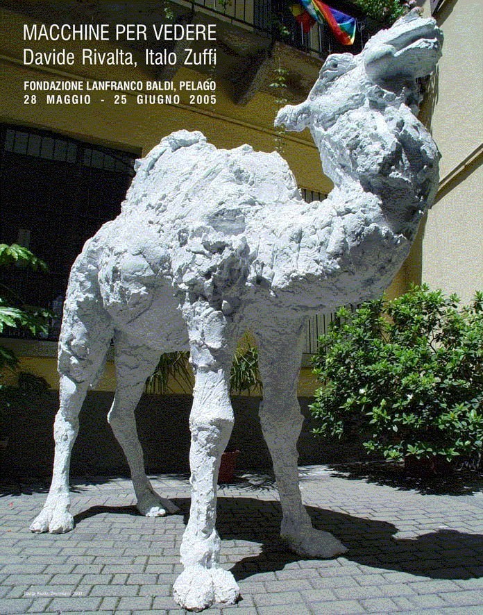 Davide Rivalta (Bologna – Italia, 1975) realizza animali in dimensione reale, come un dromedario o dei gorilla, in quanto oggetti, traducendoli fondamentalmente in ingombro di spazio. In Rivalta non c’è una volontà di interpretazione bensì una diretta trasposizione della sintesi in immagini di questi animali in dimensione plastica. Queste sculture, pur dichiarando subito il loro scopo di pura presenza, chiamano in causa paesaggi o contesti che comunque rimangono ignoti allo spettatore, provocando così in lui un forte impatto straniante ed epifanico rispetto al luogo in cui vengono collocate.