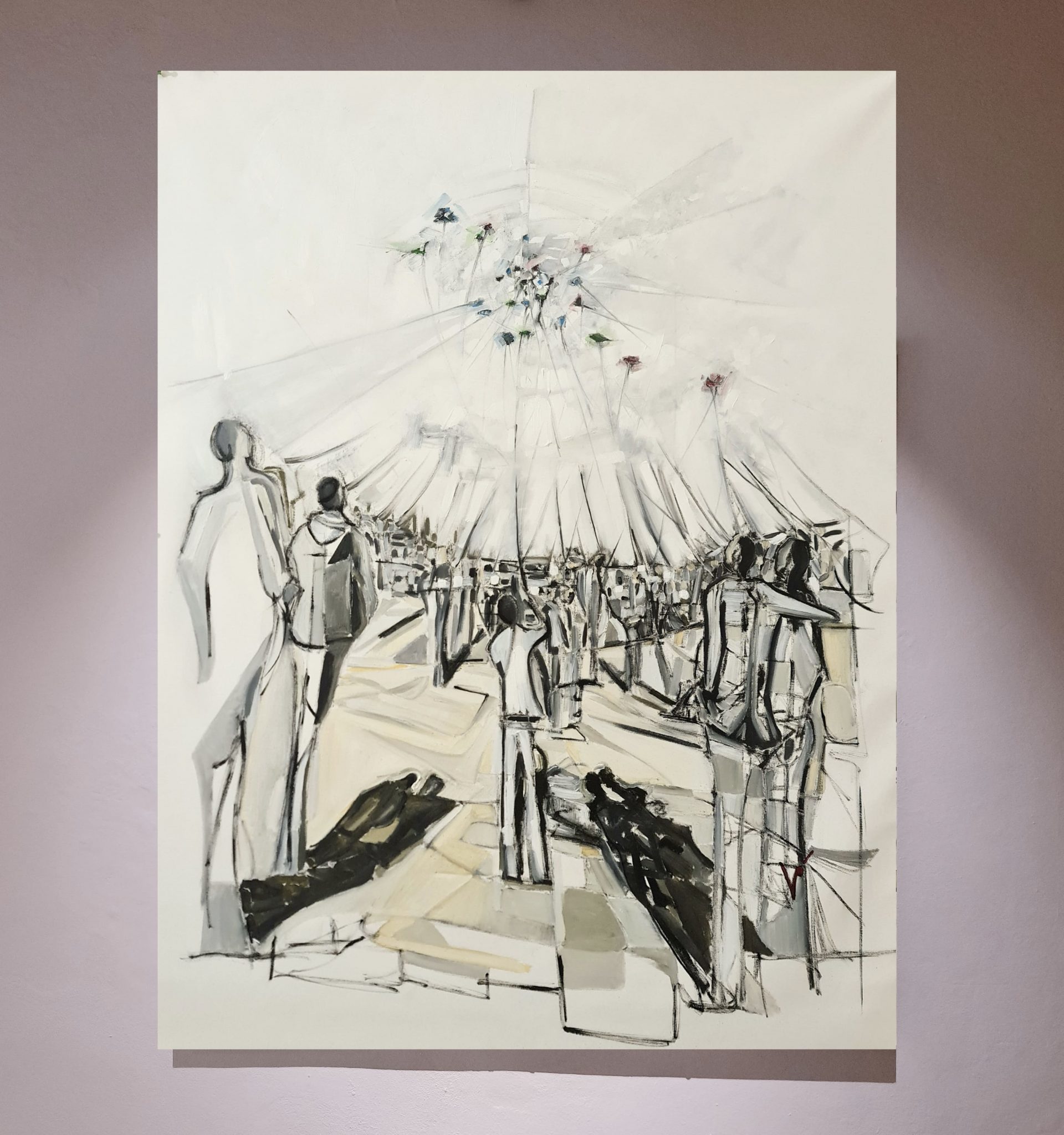 Davide è un figurativo gestuale sulla quale il mondo dell'arte italiana dovrebbe porre attenzione. Dipinge nella stessa maniera in cui vive la propria esistenza in un mondo fatto di contrasti, di bianchi e di neri. Lui ama la materia e non ha paura di sporcarsi le mani, vuole tastare e assaporare ogni teoria, ma al tempo stesso è capace di sognare. Durante il suo dream, vola sopra certe altitudini dove è difficile seguirlo, eppure è partito da un carboncino e da una tela bianca, senza telaio, appesa come un lenzuolo. Nelle sue opere siamo pervasi dall'assenza di gravità, da figure geometriche che restituiscono l'essenziale della figura umana, da luci e ombre, eppure ciò che emerge maggiormente è sempre il nostro viaggio interiore, il viaggio dell'anima. Qualcosa di personale, qualcosa di differente per ognuno di noi. Durante la mostra che gli ho dedicato presso lo Spazio Fase, in occasione di Bergamo Brescia capitali della cultura, ho visto più di un individuo piangere di fronte alle sue opere. Non mi stupisce e non voglio nemmeno dare una spiegazione perchè un'altra cosa che accomuna le opere di Davide e Davide persona, è l'aura di mistero. Un mistero che va rispettato. L'esposizione fatta ad Alzano Lombardo, nell'ex cartiera Pigna, è stata davvero suggestiva proprio per il contrasto delle opere del Romanò con questo storico edificio industriale. In quell'occasione ho selezionato diverse opere, appartenenti a differenti cicli. Mentre le osservavo nei vari giorni dell'evento mi rendevo conto di quanto l'artista comasco sia in grado di spaziare in soggetti e colori praticamente opposti l'uno con l'altro, senza perdere la propria identità. E' con una produzione più avanzata, da sperimentazioni sull'acciaio, dove il tratto del Romanò riesce a splendere ancora maggiormente, che vi presentiamo la mostra personale " Il Peso del Sogno " che rende omaggio ad un'arte dal grande impatto emozionale.