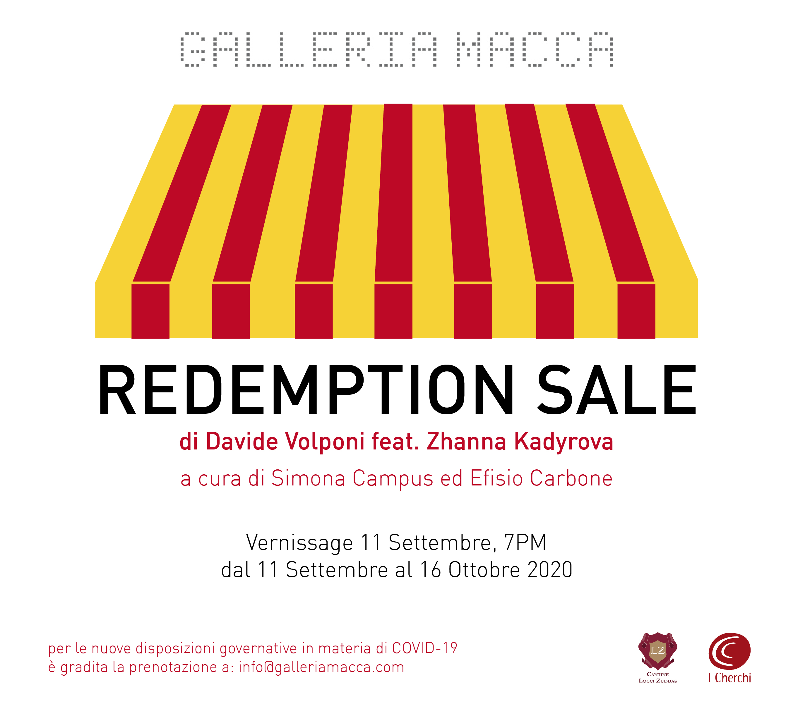 Galleria Macca è presenta Redemption Sale, terza mostra personale di Davide Volponi (Cagliari, 1973), con la partecipazione straordinaria di Zhanna Kadyrova (Ucraina, 1981), a cura di Simona Campus ed Efisio Carbone. Per gli allestimenti, l’artista si è avvalso della collaborazione di Pietro Rais, scenografo teatrale e cinematografico Cagliaritano. Il vernissage si terrà venerdì 11 Settembre, dalle ore 19, nel rispetto delle disposizioni anti COVID-19 l’accesso sarà contingentato, ed è gradita la prenotazione a info@galleriamacca.com
