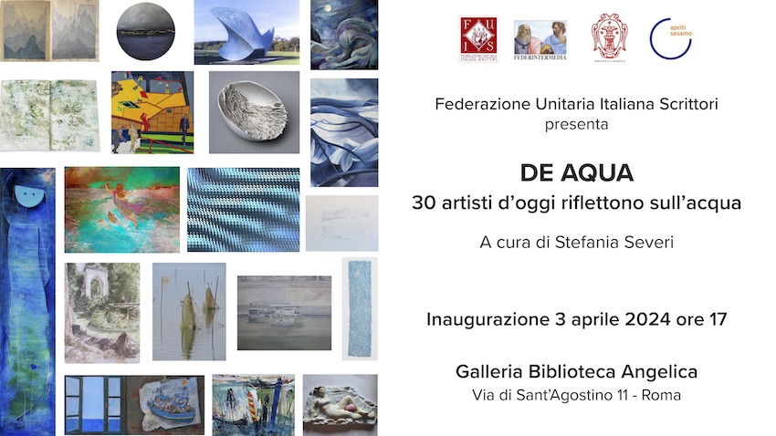 Mercoledì 3 aprile 2024 alle ore 17.00, inaugura, presso le sale della Galleria della Biblioteca Angelica, prestigioso spazio espositivo adibito alle mostre di arte contemporanea, il progetto De Aqua - 30 artisti riflettono sull’acqua, a cura di Stefania Severi, promosso e organizzato dalla FUIS - Federazione Unitaria Italiana Scrittori e Federintermedia, fortemente voluto dal Presidente della FUIS, Natale Antonio Rossi.