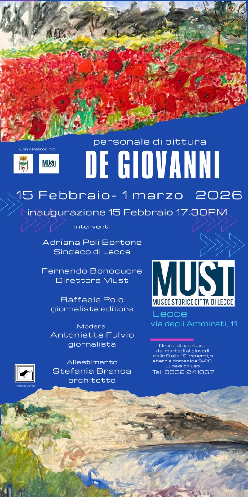 Dopo aver dipinto en plein air la costa salentina che da Leuca arriva ad Otranto, fedele ad una poetica che vuole un’arte non solo estetica ma anche etica rintracciando attraverso segni e colori il dialogo tra uomo e Natura, l’artista specchiese ritorna ad esporre a Lecce nelle sale del Must