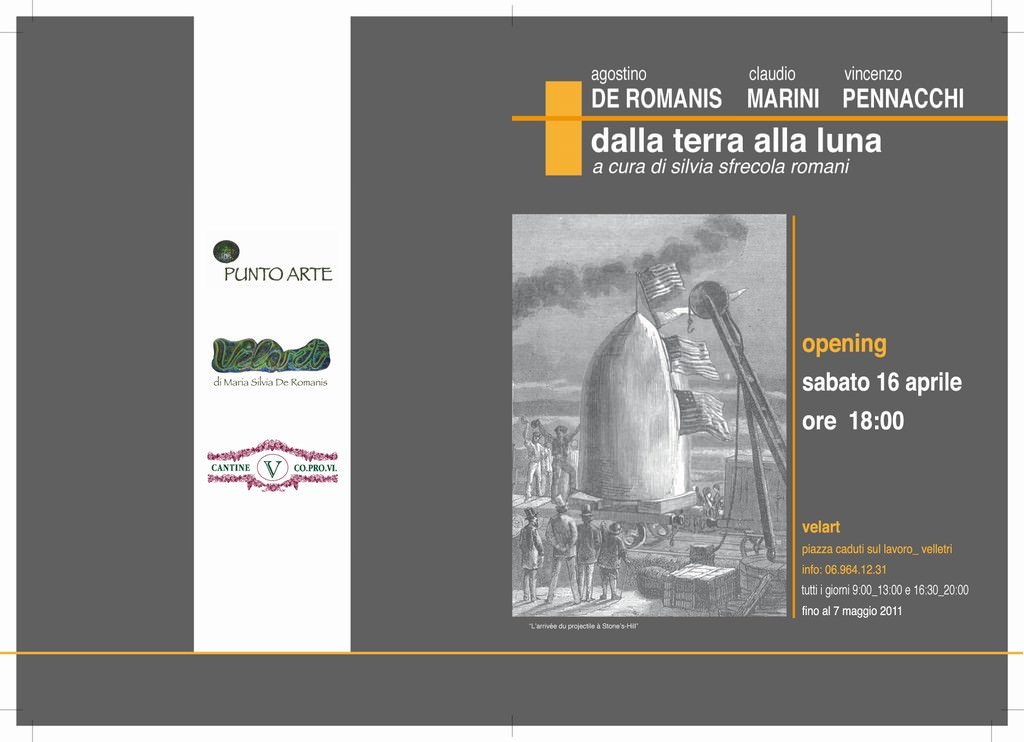 “Pare sia stato Luciano di Samosata tra i primi ad immaginare un viaggio sulla luna. Chi non ricorda il povero Astolfo spedito da Ariosto a caccia del senno perduto di Orlando? E poi Keplero, che, in uno straordinario rovesciamento di prospettiva con una terra vista dalla luna, ci manda Duracoto, un ragazzino figlio di una strega. Di una cintura di ampolle piene di rugiada si serve invece Cyrano (de Bergerac) che, sbarcato sulla luna, viene scambiato per uno struzzo e messo in gabbia. Storie di viaggi prima che di arrivi, di percorsi prima che di approdi, come quello fantastico di Nicholl, Barbicane e Michel Ardan novelli astronauti protagonisti del racconto di Verne, come quello – vero - di Agostino De Romanis, quello – beffardo - di Claudio Marini e quello – mentale - di Vincenzo Pennacchi. I tre artisti veliterni si sono messi in gioco per raccontare e raccontarsi attraverso il proprio personalissimo viaggio verso un sogno: De Romanis, con imperturbabile equilibrio e pittorica saggezza, narra storie di magia e mistero, costruite su enigmatiche relazioni tra terra e cielo, tra numeri e cosmo, tra matematica e cromatismo viscerale, sonoro, primigenio. Claudio Marini, con la ‘solita’ sottile, beffarda, intelligente quanto inossidabile ironia, parte dalla celeberrima prima impronta sulla luna di Armstrong per farla diventare una sorta di sigla, di logo, come i marchi a fuoco sui sederi dei cavalli e quindi, paradossalmente, svuotarla di significato. Vincenzo Pennacchi preferisce concentrarsi sulla spasmodica preparazione del viaggio e, come il più attento dei navigatori, predispone nei minimi dettagli ogni cosa, mettendo freneticamente a punto, prima di partire, una serie di dettagliatissime “mappe”. Poco importa che siano mentali o reali, visionarie o geographically correct. A lui servono così.”