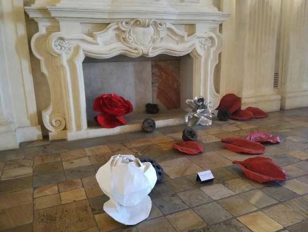 La quarta artista in mostra, Luisa Valentini, è presente con un lavoro proposto nell’ambito di Art Site Fest 2018, un percorso nei linguaggi della contemporaneità, tra fotografia, scultura, pittura, teatro e musica in alcune delle più belle residenze storiche del Piemonte. L’opera è costituita da tre gigantesche rose collocate accanto al monumentale caminetto: una rosso carminio, una bianca, una argentea (di alluminio), e tutt’intorno sono sparsi a terra petali, semi e frutti: Frame of Nature.