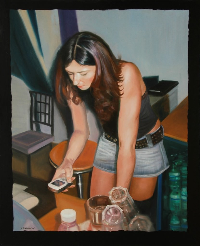 Con i tratti fugaci di Loredana Cacucciolo si tratteggiano interni di abitazioni, studiati da luci che entrano da piccole finestre e colgno dettagli sempre diversi. Non è semplice dipingere secondo i reggimi della nuova figurazione, circostanziare attimi quotidiani, Luisa Valenzano è imponente proprio in questo, nel dettagliare scene di vita giornaliera, evidenziare i volti, le espressioni, i problemi, gli atteggiamenti. La grandezza di una giovane artista non risiede solo nel riuscire a tratteggiare con cura estrema ogni dettaglio, la preziosità sta oltre, nel riuscire ad emozionare, nel consentire di leggere negli sguardi tentativi di capirsi. Attraverso l’abile genialità di Angela Vinci che su una tavolozza fatta di colori vividi, di brillanti blu e viola, gialli e rosa crea un equilibrio esclusivo.