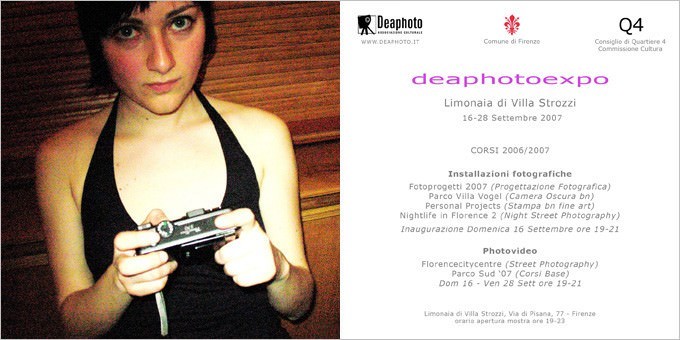 La rassegna fotografica – a cura dell’Associazione Culturale Deaphoto in collaborazione con il Quartiere 4 del Comune di Firenze – presenta cinque mostre e due proiezioni photovideo degli studenti dei Corsi di Fotografia 2006-2007