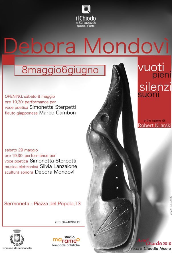 Il secondo, invece, è programmato per sabato 29 maggio e avrà ancora come protagonista la voce poetica di Simonetta Sterpetti in dialogo, questa volta, con una scultura sonora della Mondovì, la cui musica integrata è opera della compositrice Silvia Lanzalone. L’opera scultorea è stata progettata per risuonare a determinate frequenze dello spettro acustico e consiste di elementi cavi di diverse dimensioni entro cui i suoni vengono amplificati ed elaborati coerentemente alla conformazione e grandezza della cavità.
