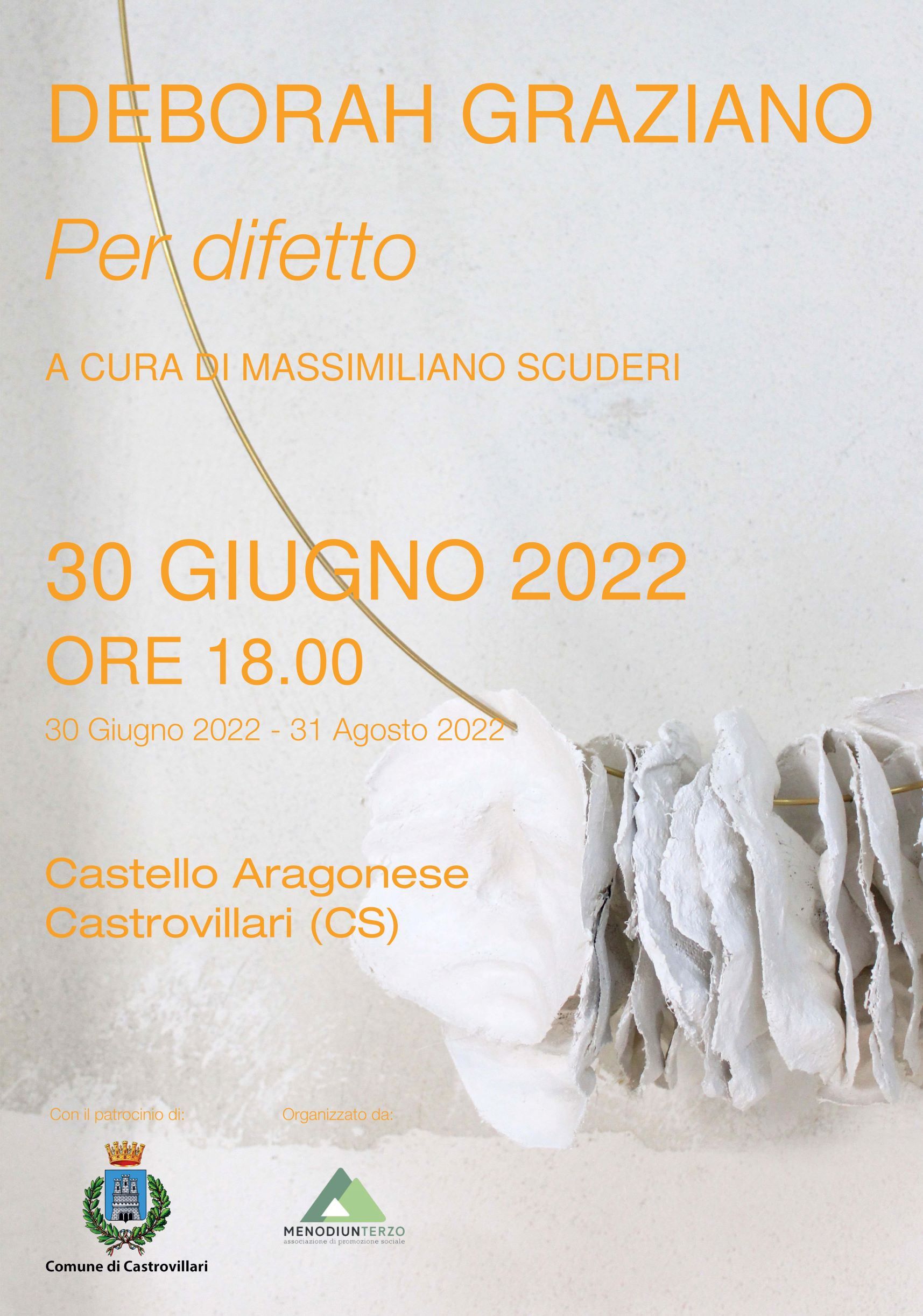 Per difetto è la personale dell’artista Deborah Graziano, curata da Massimiliano Scuderi, che presenta i lavori di scultura e installazione frutto della sua più recente ricerca artistica, che sviluppa principalmente tematiche legate all’identità e al corpo in chiave simbolica del tutto personale.