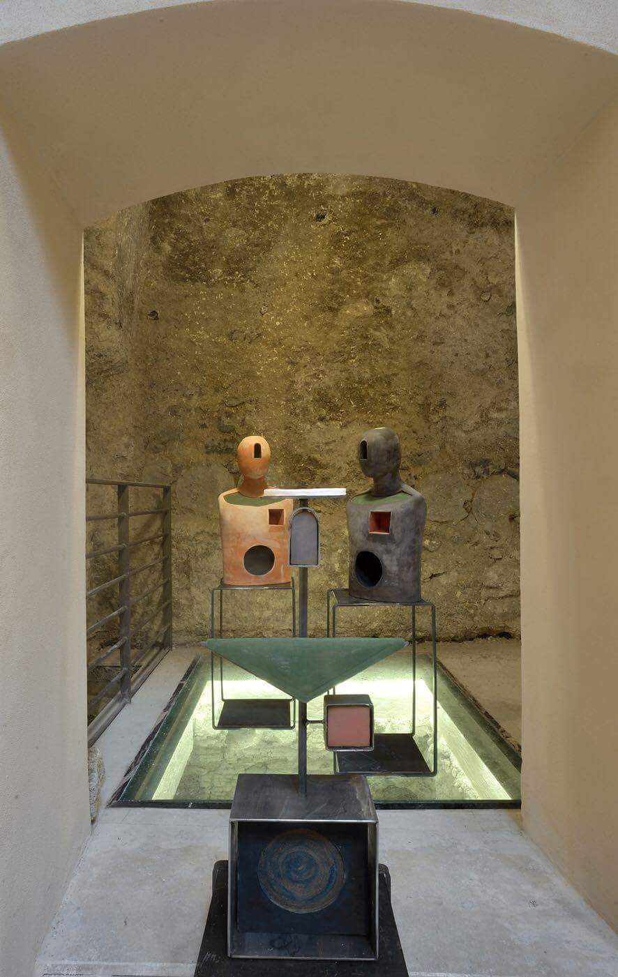 La Napolitano ha esplorato anche le proprietà di materiali diversi quali il ferro, con cui ha forgiato la grande mano di tre metri, scarnificata nella materia e resa essenziale nel tratto e le eleganti sedie che sono completate da cuscini in terracotta, turgidi come le carnose foglie dell’echinocactus , da cui spuntano chiodi aguzzi, o da schienali costituiti dalle acuminate pale dei fichi d’India.