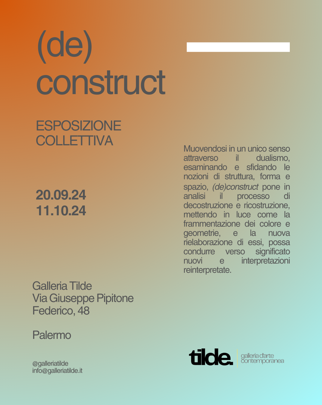 Muovendosi in un'unica direzione attraverso il dualismo, esaminando e sfidando le nozioni di struttura, forma e spazio, (de)construct analizza il processo di decostruzione e ricostruzione, evidenziando come la frammentazione di colori e geometrie, e la loro successiva rielaborazione, possano portare a nuovi significati e interpretazioni.