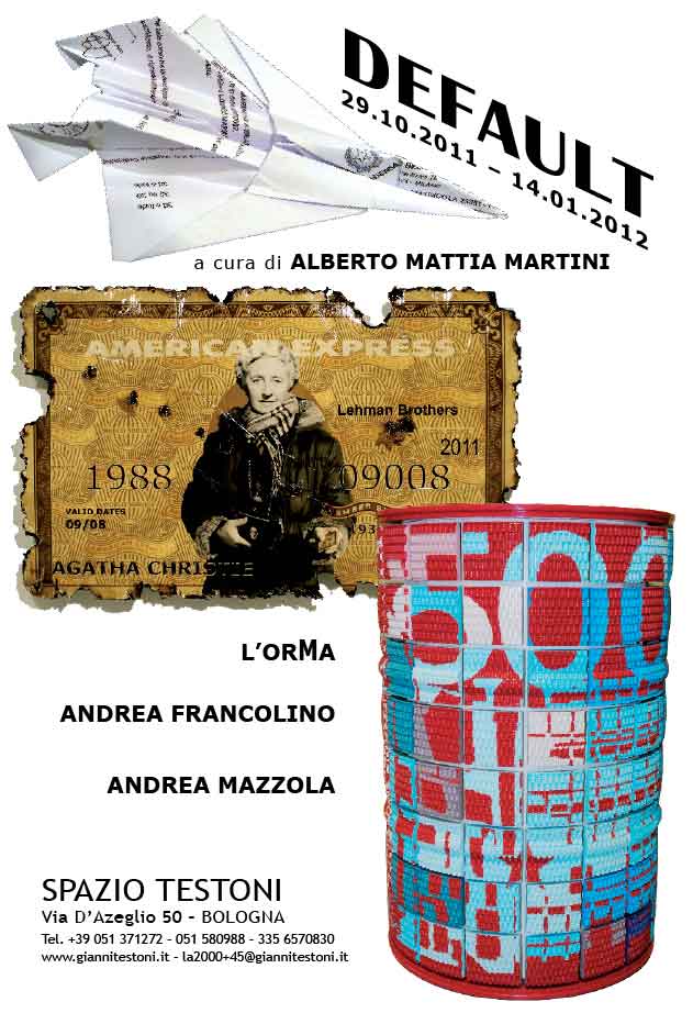 Non e’ più soltanto crisi, siamo davanti al rischio DEFAULT, faccia a faccia con il fallimento del sistema economico e finanziario globale. La galleria Spazio Testoni, nella sua ormai consolidata attenzione alle vicende espressive più contestuali, raccoglie questa sfida e propone tre artisti.